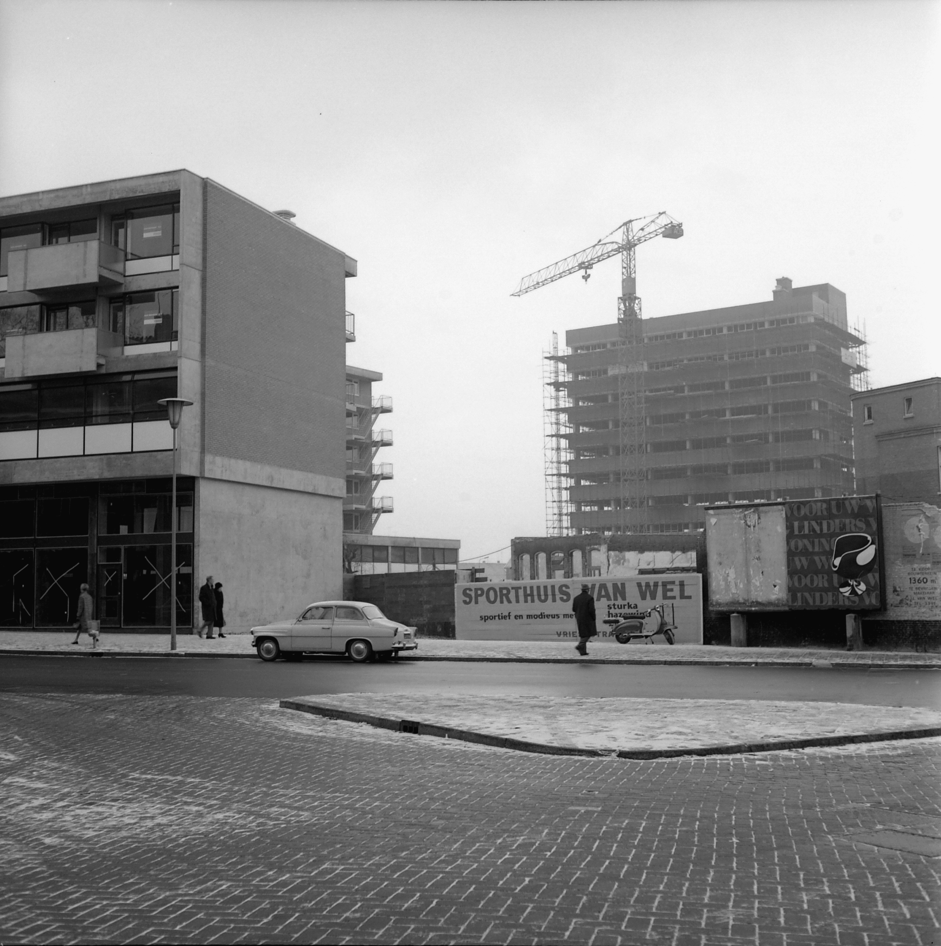 - Bagijnhof hoek Johan de Wittstraat. Sloop van het bestedelingenhuis. Op de achtergrond de bouw van de flats op het Achterom.