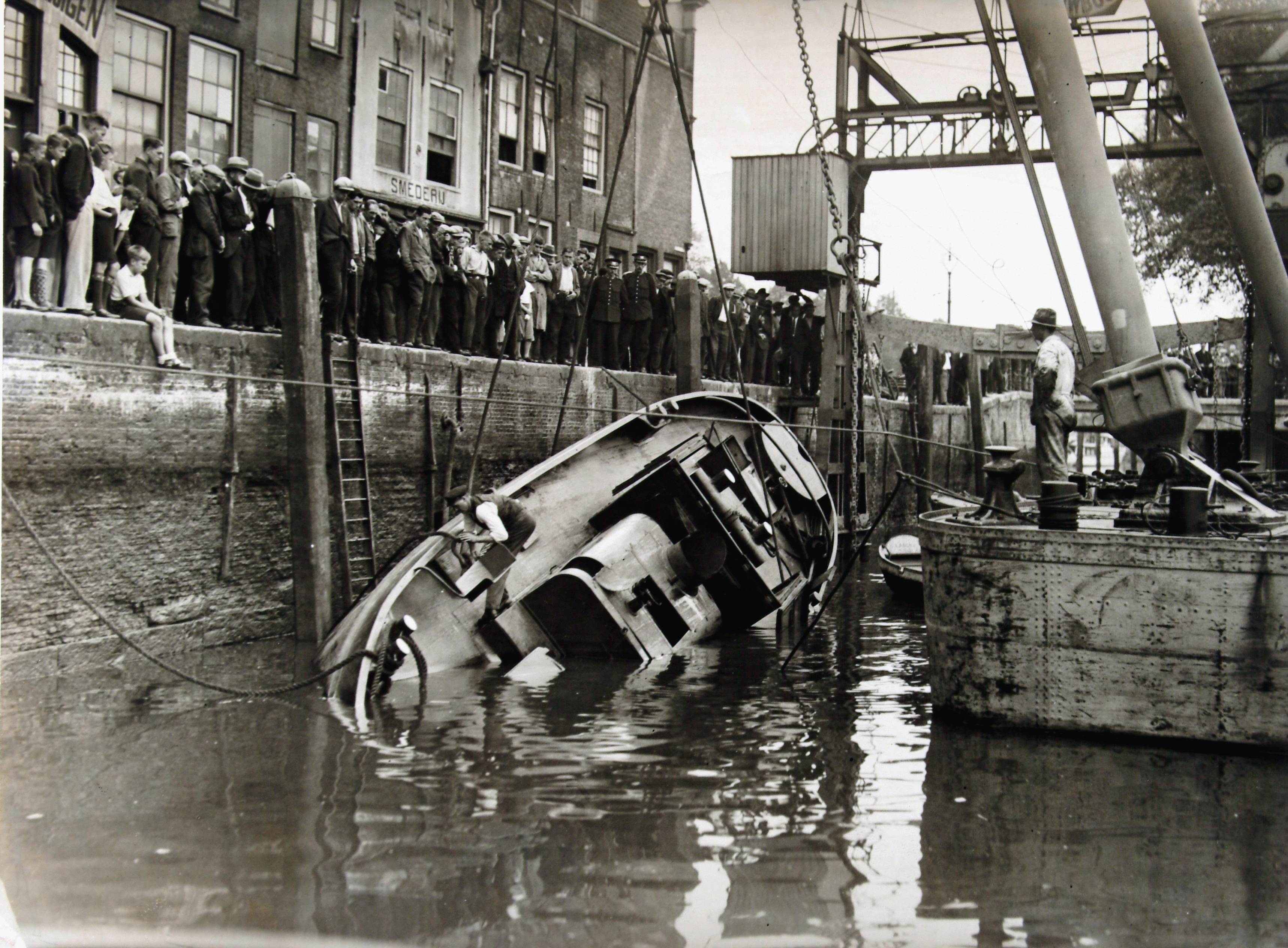 - Optakelen van een gezonken boor uit de Kuipershaven hoek Aardappelmarkt.