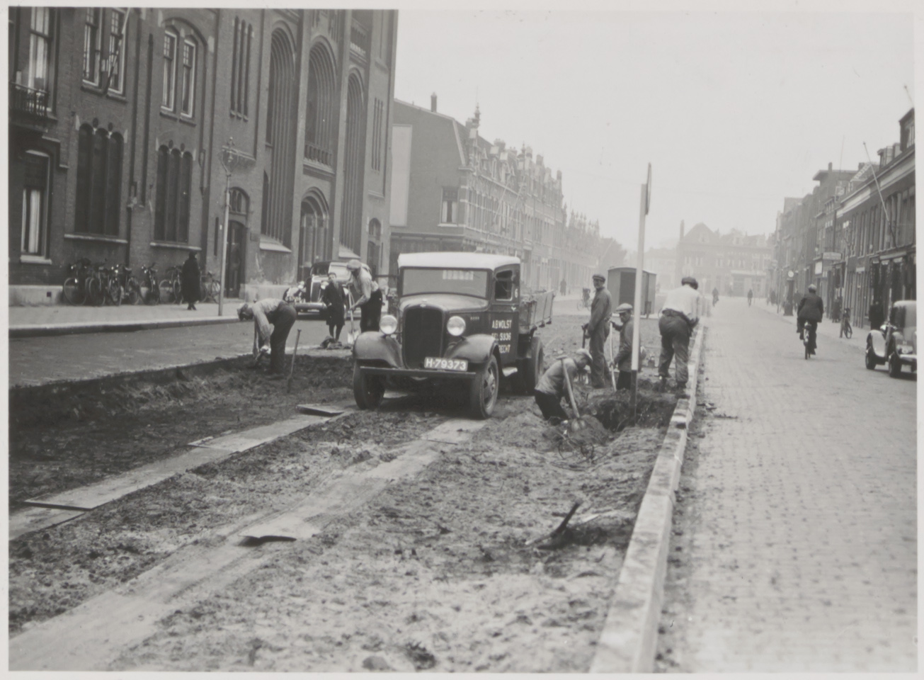 - Stratenmakers op de Blekersdijk bij de Wilhelminakerk op de hoek van de Koningin Wilhelminastraat, gezien in de richting van de Cornelis de Wittstraat.