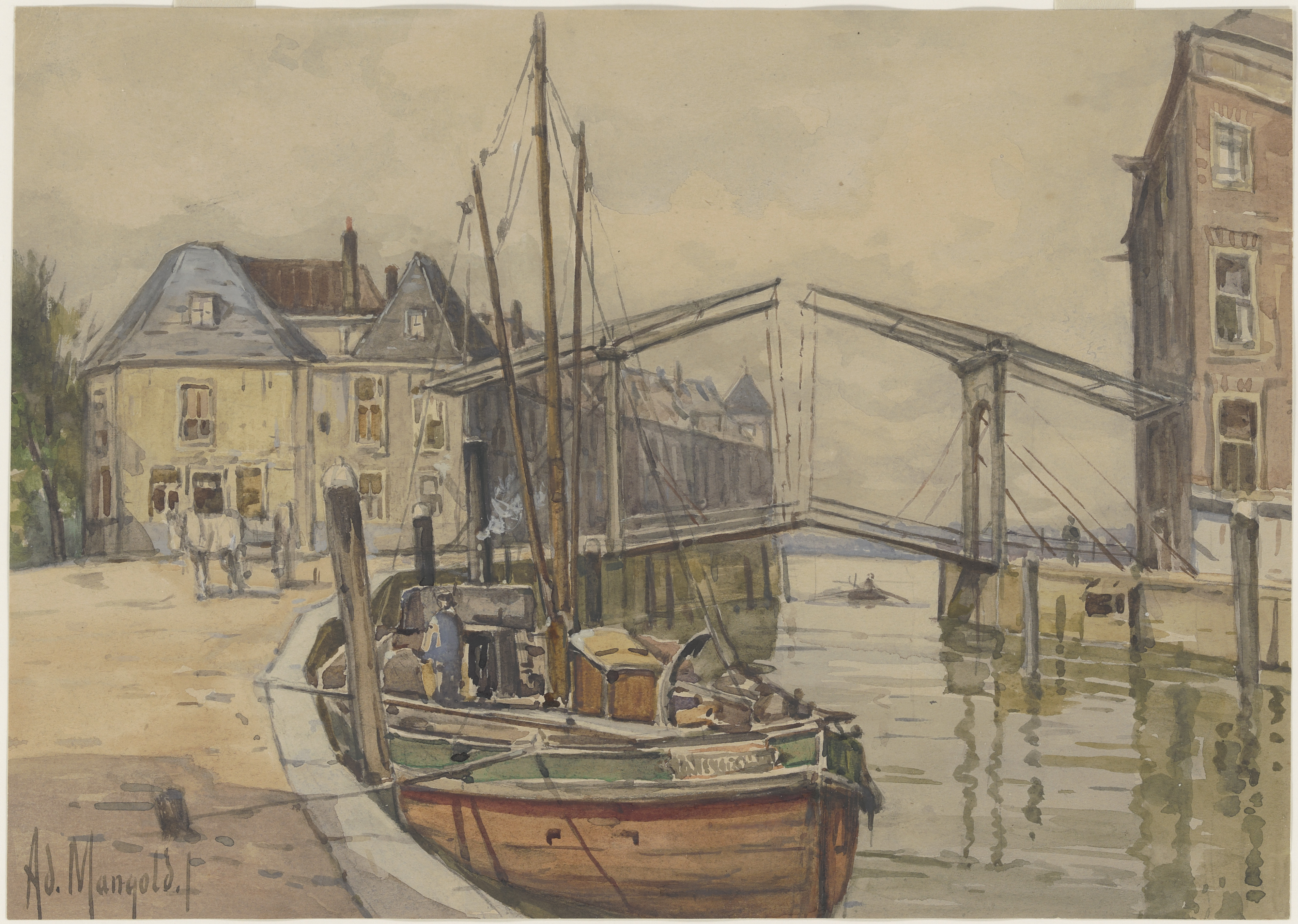 - Aquarel van een vrachtschip in de Nieuwe Haven, afgemeerd langs de Houttuinen. Links van de Engelenburgerbrug staat rondeel Engelenburg, rechts de Blauwpoort.
