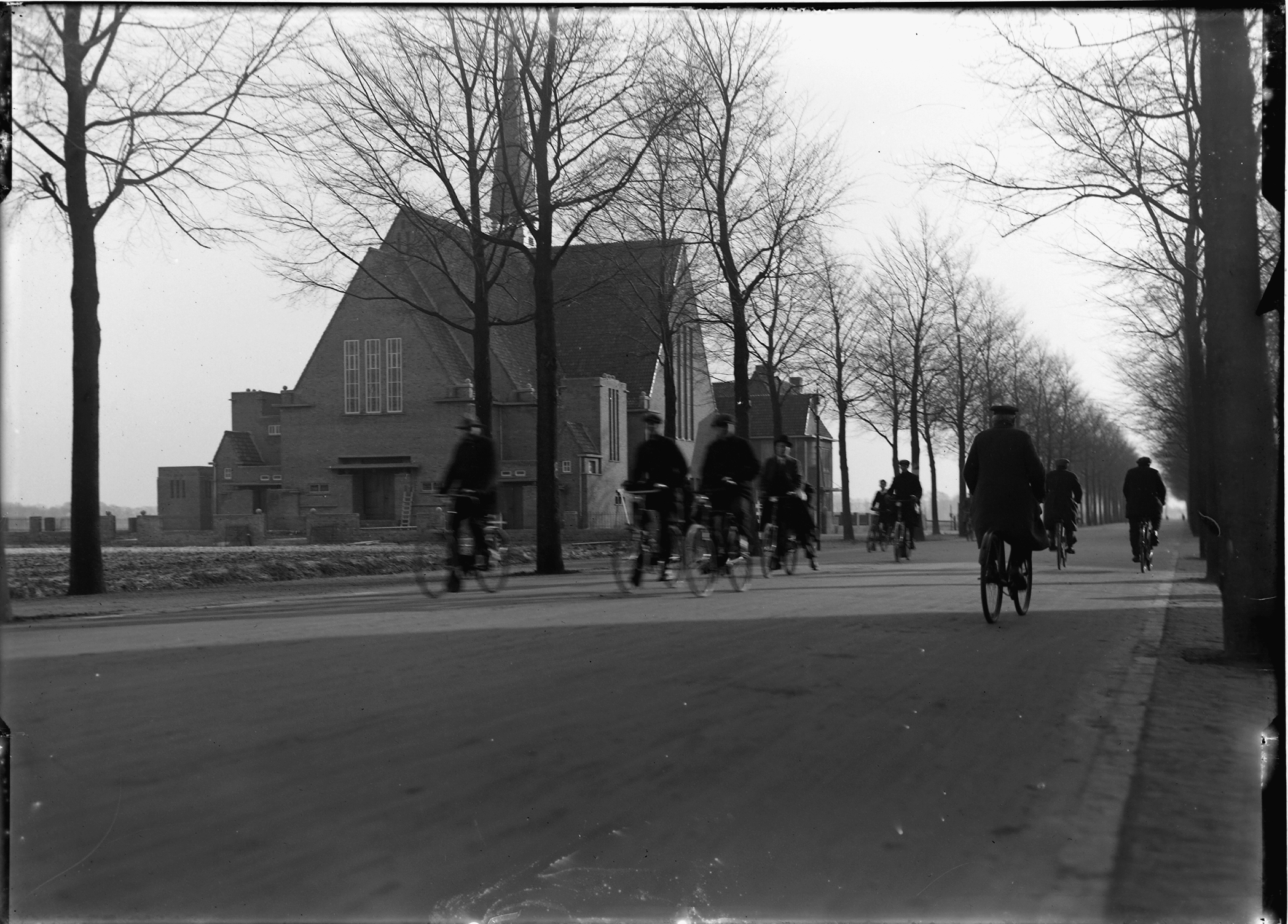 Krispijnseweg met de Julianakerk op de hoek van de Mauritsweg.