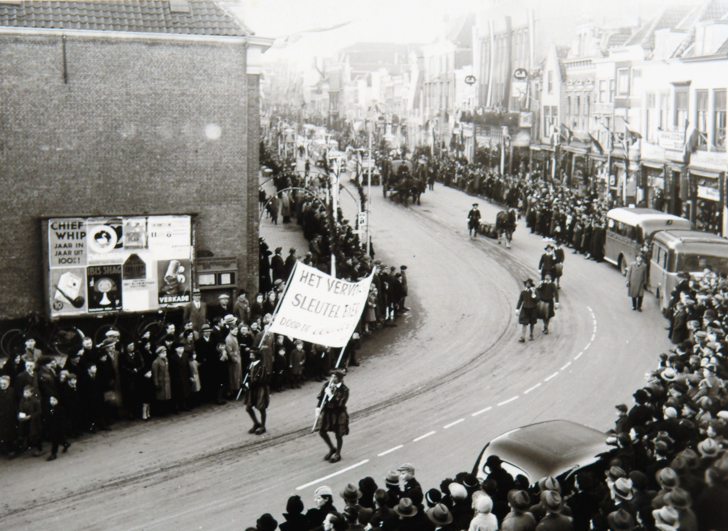 Tijdens de opening van de verkeersbrug over het Hollandsch Diep werd een verkeersoptocht gehouden. De stoet trekt vanaf het Bagijnhof de Johan de Wittstraat in.