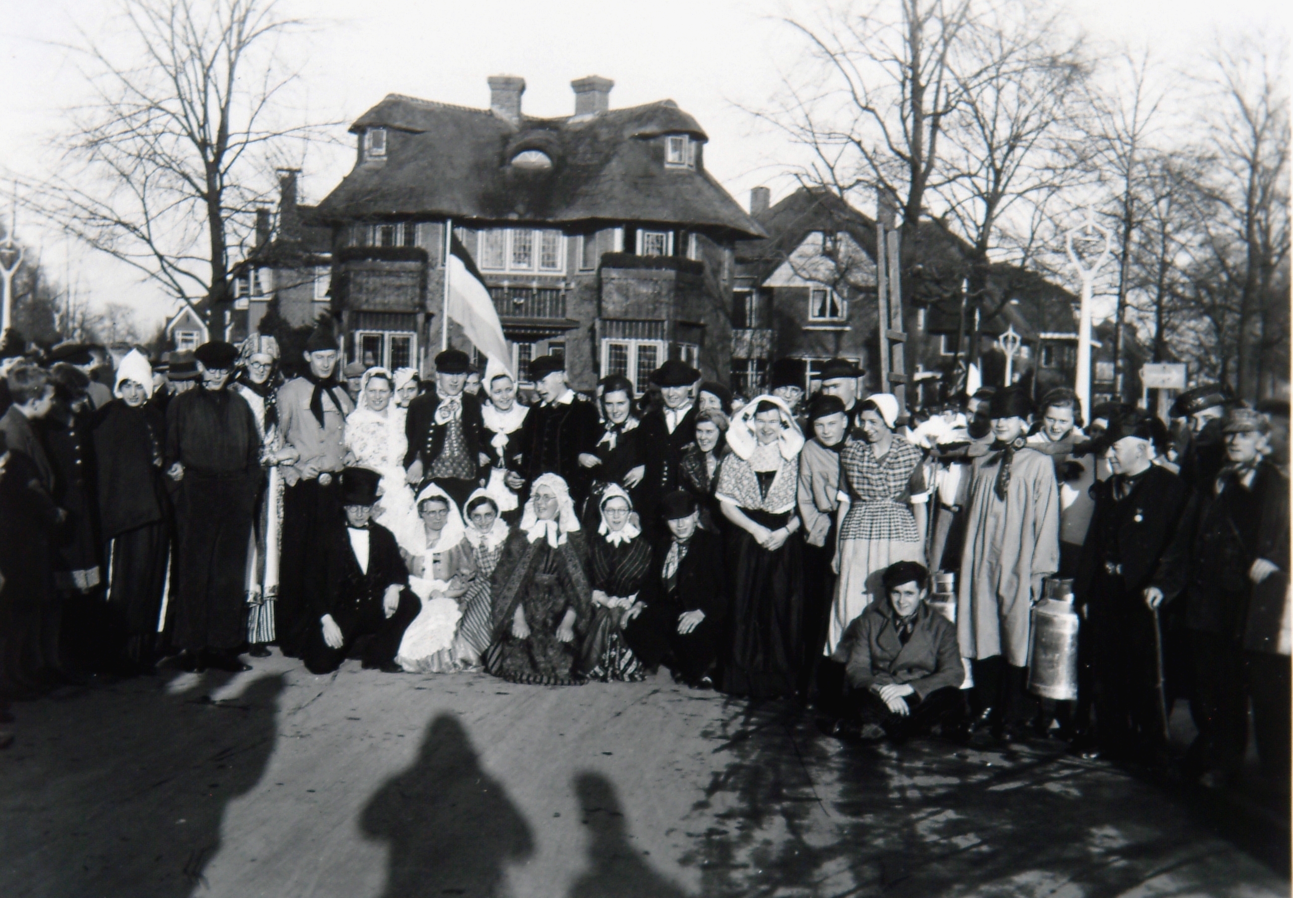 Deelnemers in klederdracht bij festiviteiten rond de opening van de verkeersbrug over het Hollandsch Diep. Zij bevinden zich voor villa De Groene Hoek, op de hoek Groendijk (links) en de Oranjelaan.