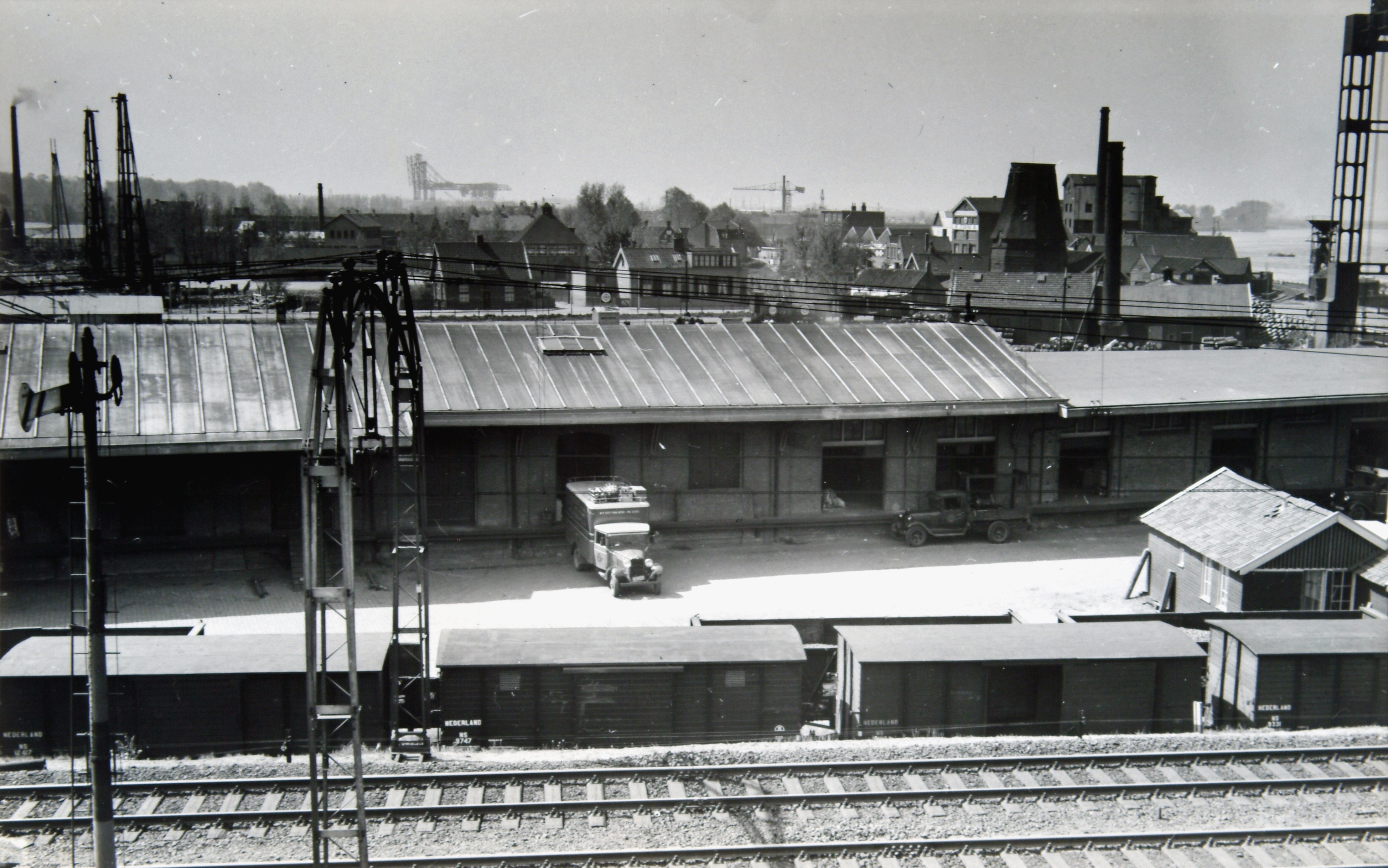 - Gezicht vanaf de Parallelweg over de Spoorweghaven (achter de loods) naar de Weeskinderendijk. Rechts de romp van molen De Pelikaan en de heftoren van de Dokbrug.