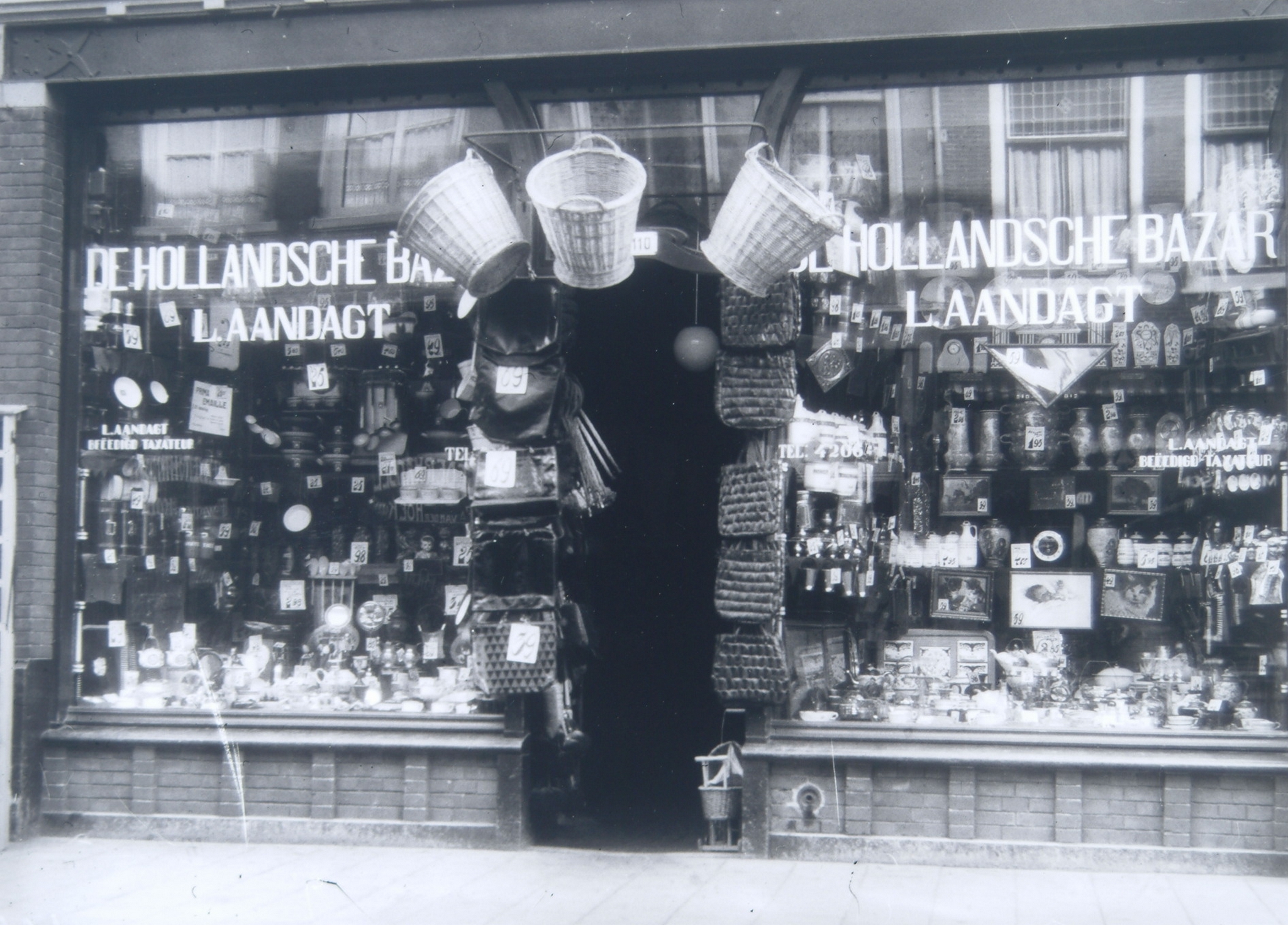 Etalage van de Hollandsche Bazar van L. Aandagt aan de Voorstraat 110 (nu 146)