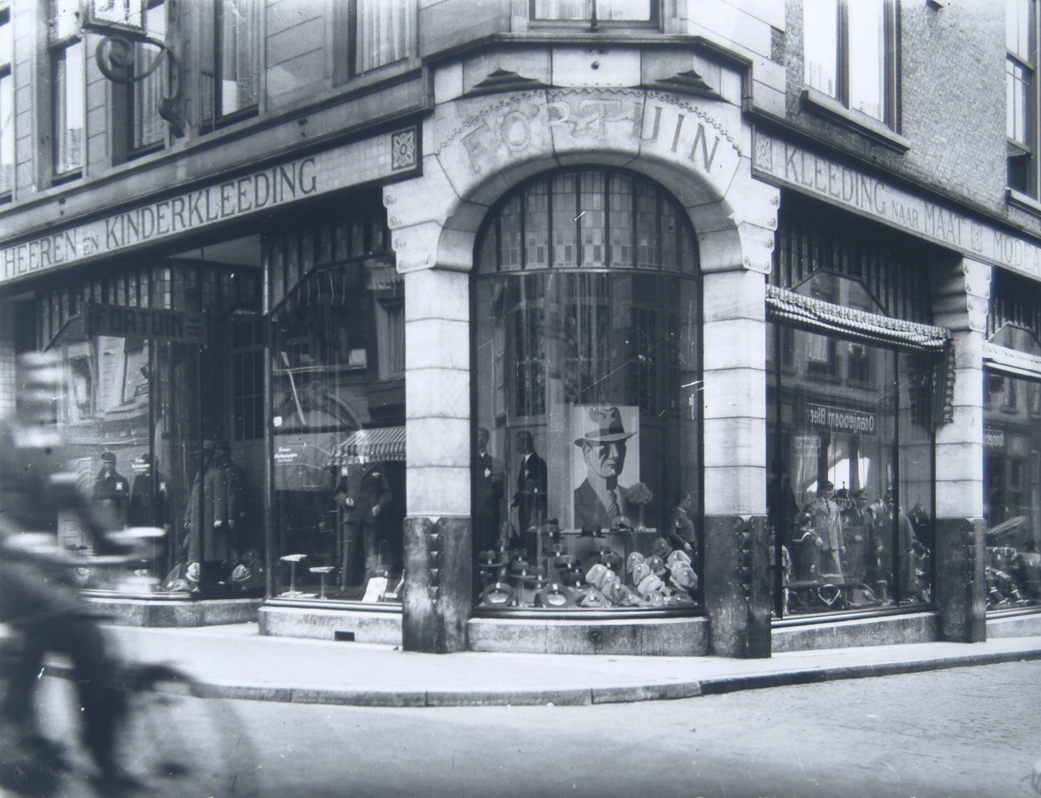 - Heeren- en Kinderkleedingmagazijn Fortuin aan de Voorstraat 180 (nu226) hoek Nieuwstraat ca. 1935