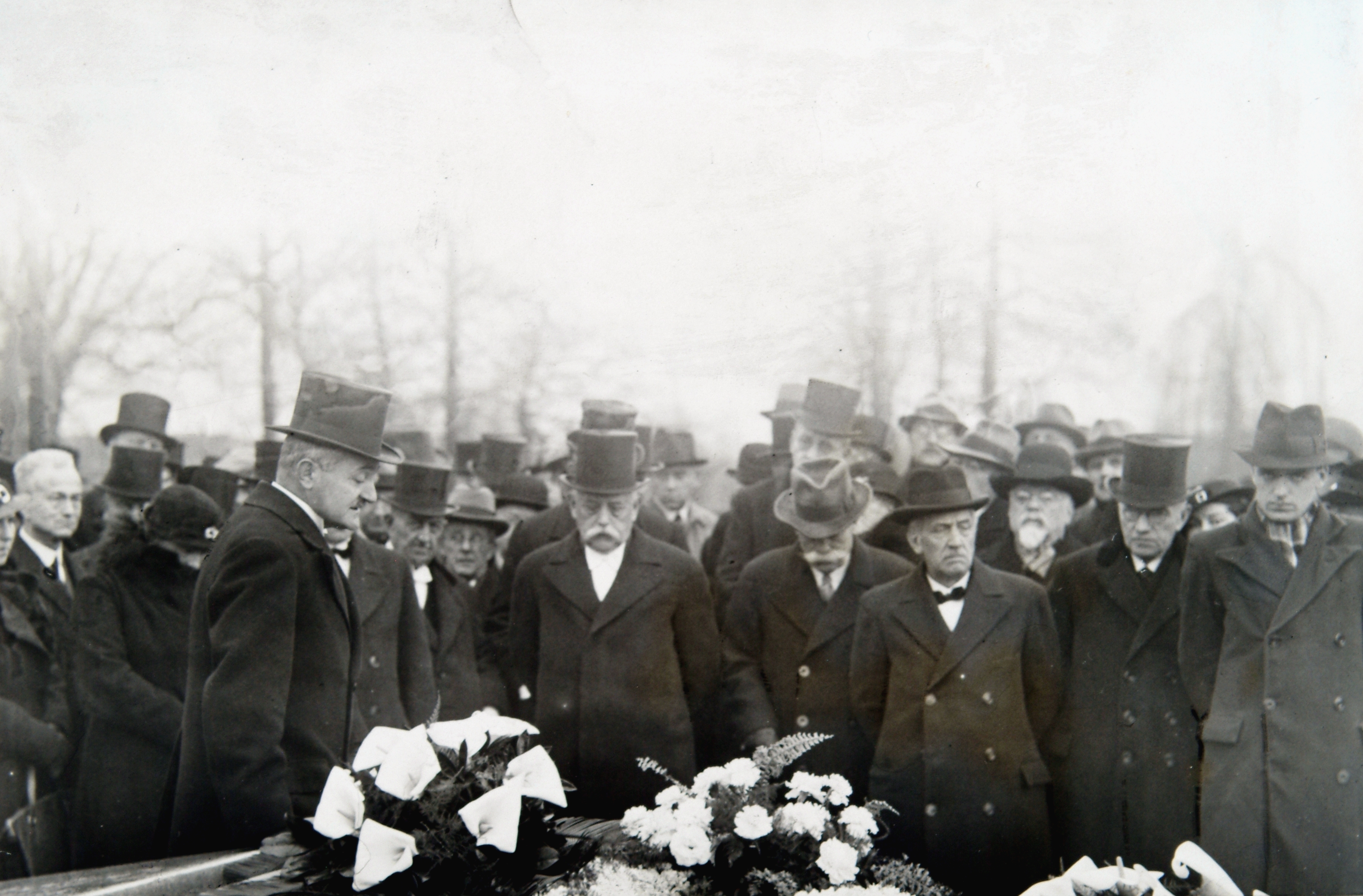 Gemeentesecretaris Poll spreekt een rede uit bij het graf van oud-archivaris van …
