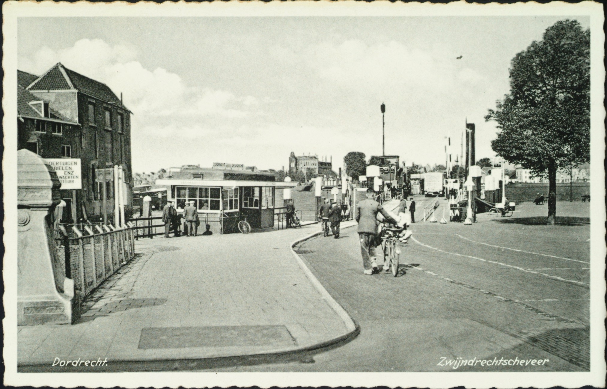 Het Blauwpoortsplein en het veer naar Zwijndrecht vanaf de Engelenburgerbrug. Links …