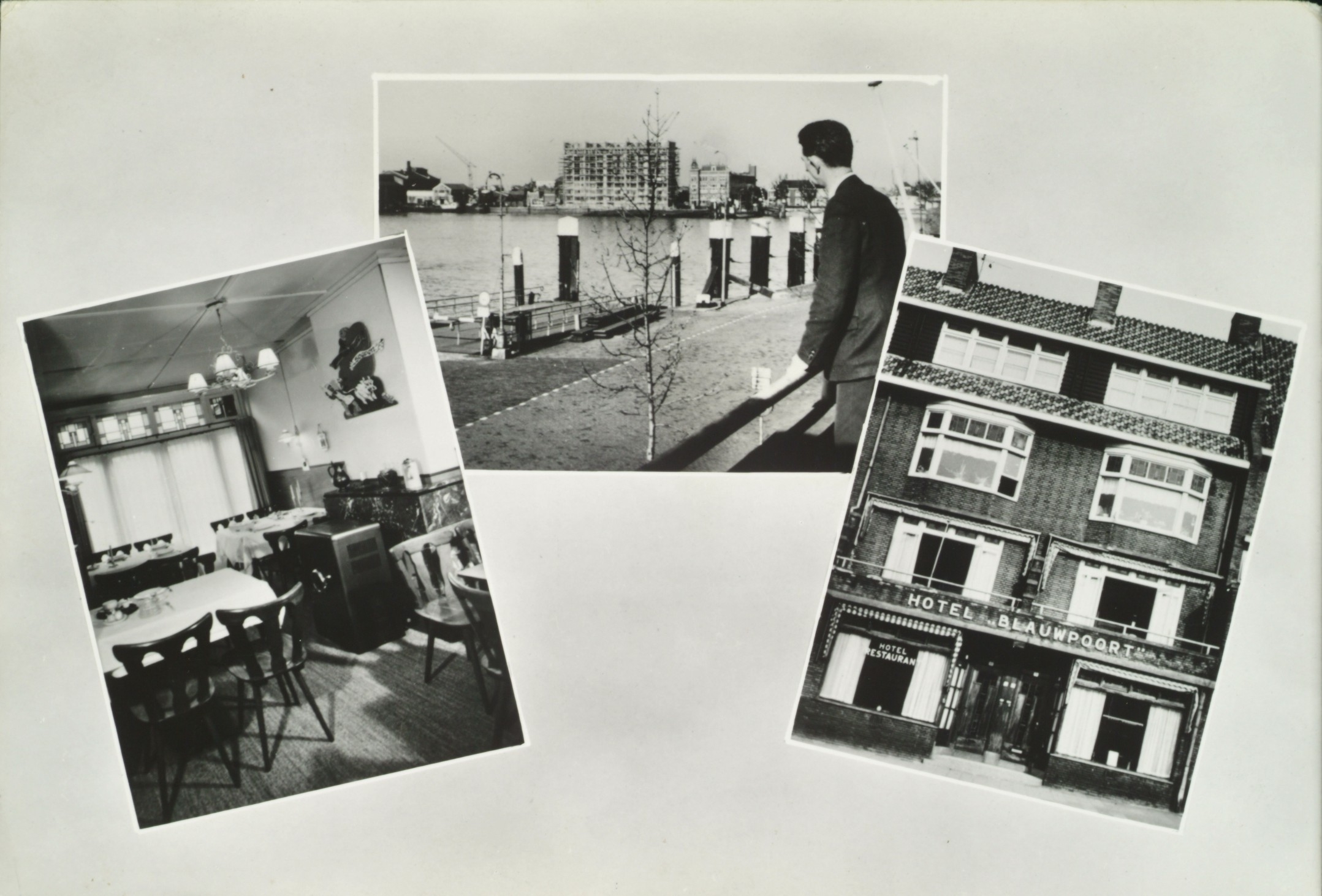 Hotel Blauwpoort aan het Blauwpoortsplein. Midden: uitzicht vanuit het hotel op de aanlegsteiger van het Zwijndrechts veer.