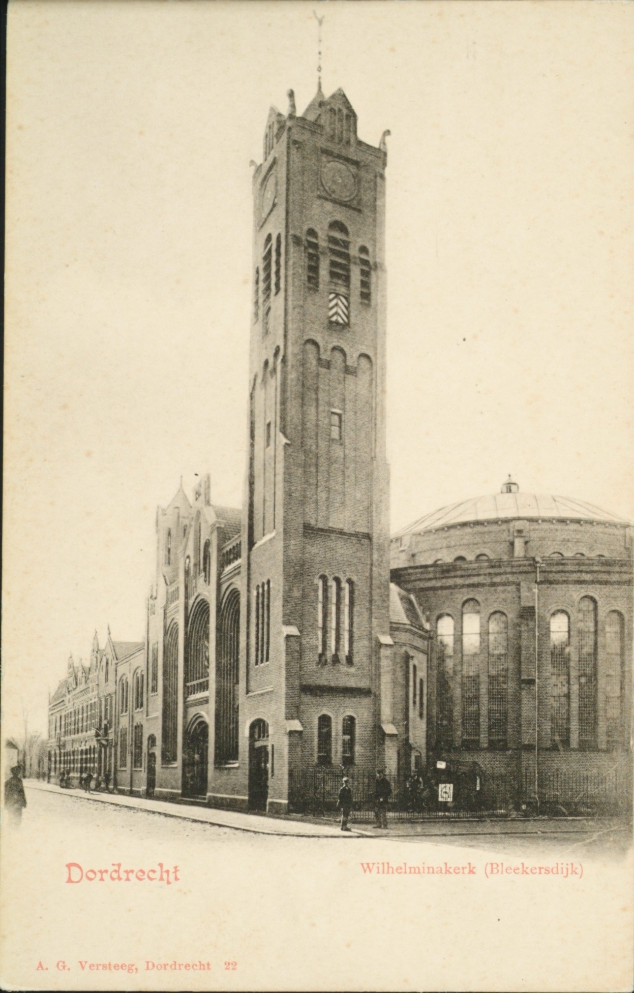 De Wilhelminakerk aan de Blekersdijk op de hoek van de Koningin Wilhelminastraat (rechts).