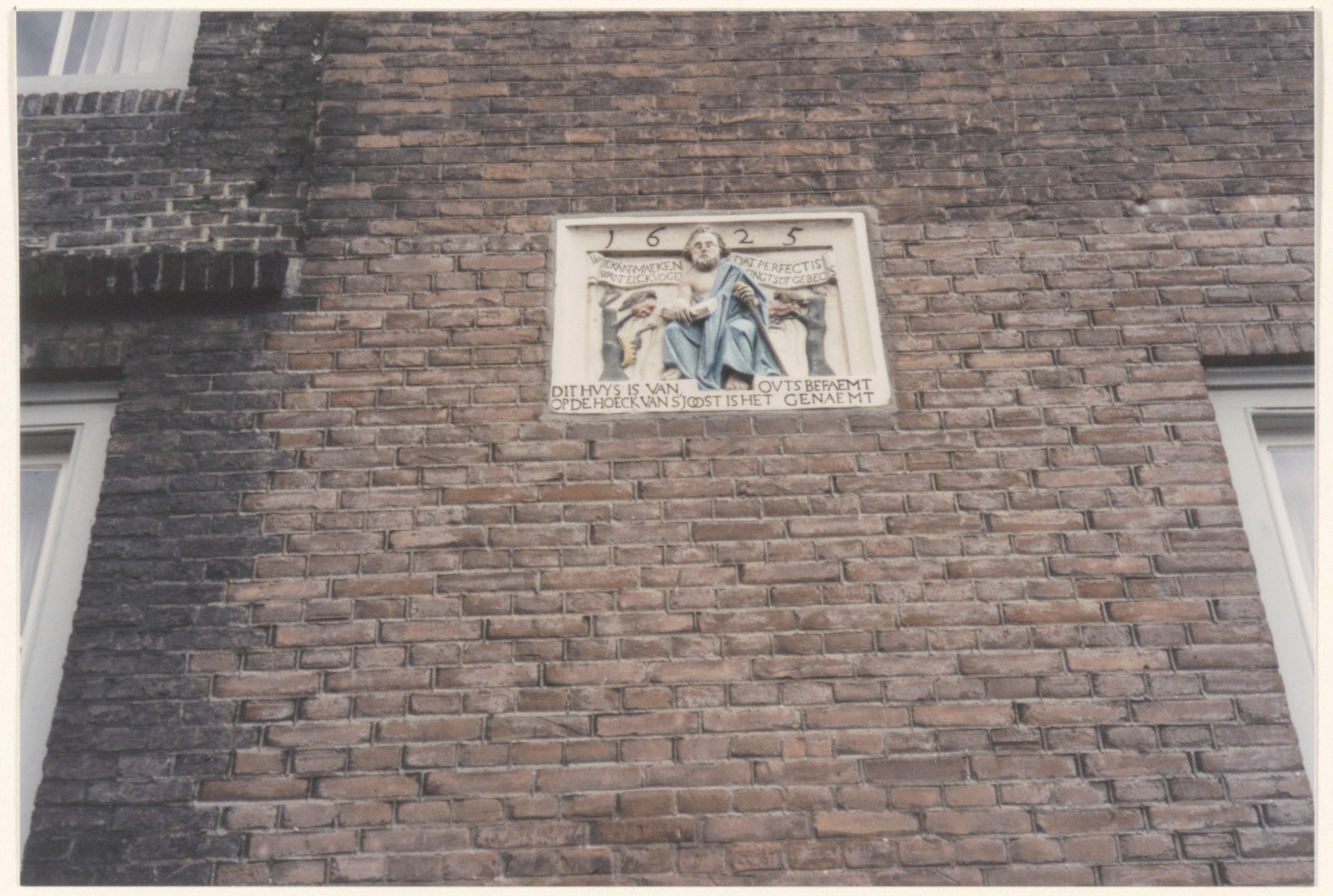 Gevelsteen op de Kuipershaven van het hoekhuis met de Aardappelmarkt, afkomstig uit het aldaar gestaan hebbende en in 1876 gesloopte huis Sint Joost. Het beeld van Sint Joost, zittend met boek en staf tussen 2 bomen, waarin vogels en de tekst: '1625/Wie kan maken dat perfect is/ wan elck voge(l) (si)ingt so 't gebekt is/ dit huys is van ovts befaemt/ op de hoeck van s ioost is het genaemt'. De steen heeft enige tijd in het depot gelegen.
