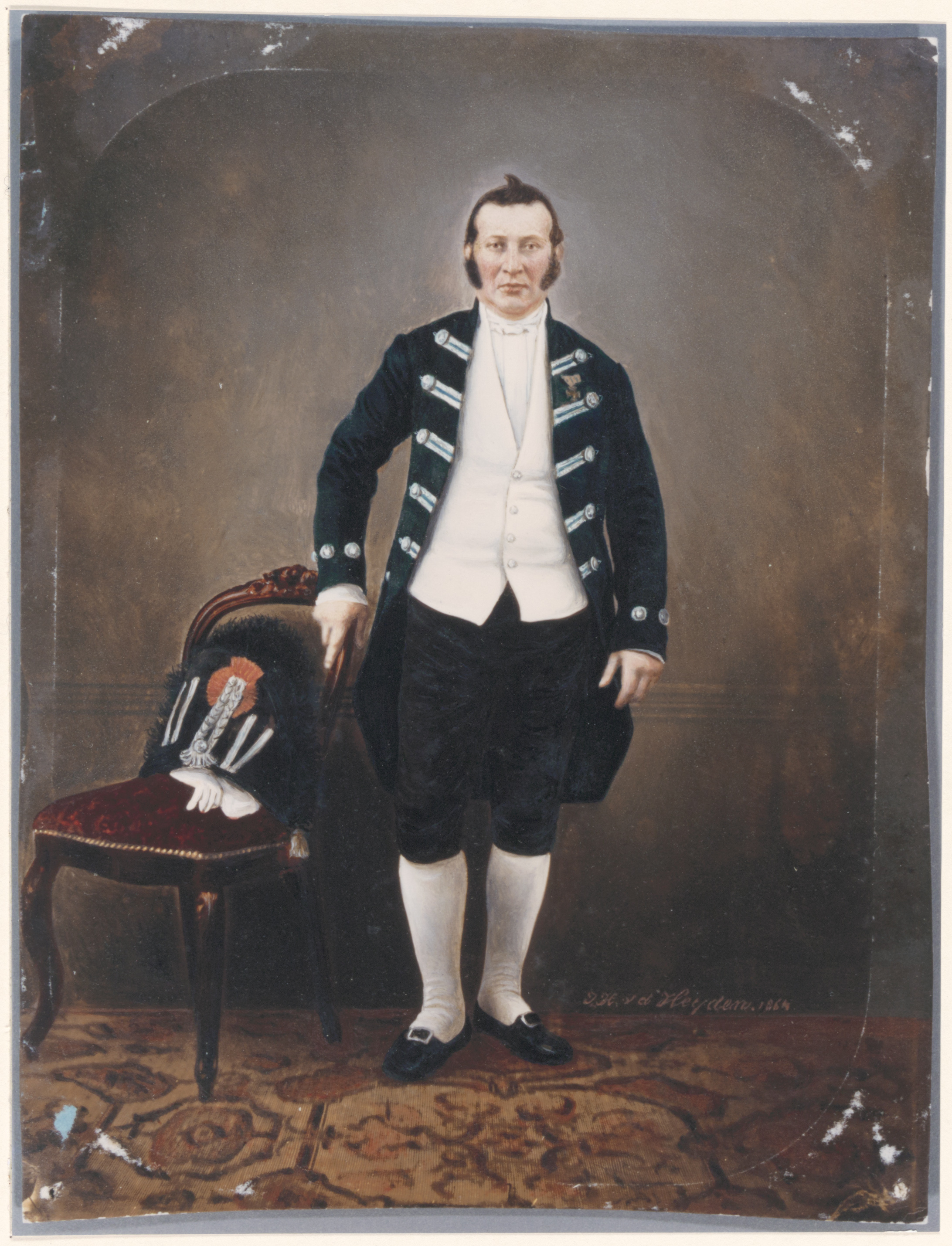 - Portret van Willem Arnold Fredrik Koopman, in koetsiersuniform, handschoenen en muts naast hem op een stoel, onderscheiding op zijn jas, geboren op 22 januari 1815 te Dordrecht, overleden aldaar op 20 juli 1866, zoon van wijnkopersknecht W.A.F. Koopman en Jenneke Scheurwater (gehuwd in 1800), koetsier van ca. 1846 tot zijn overlijden van Otto Boudewijn 't Hooft van Benthuizen (1e kamerlid, grootgrondbezitter, eigenaar/bewoner van buitenplaats Merwestein in het huidige gelijknamige park).