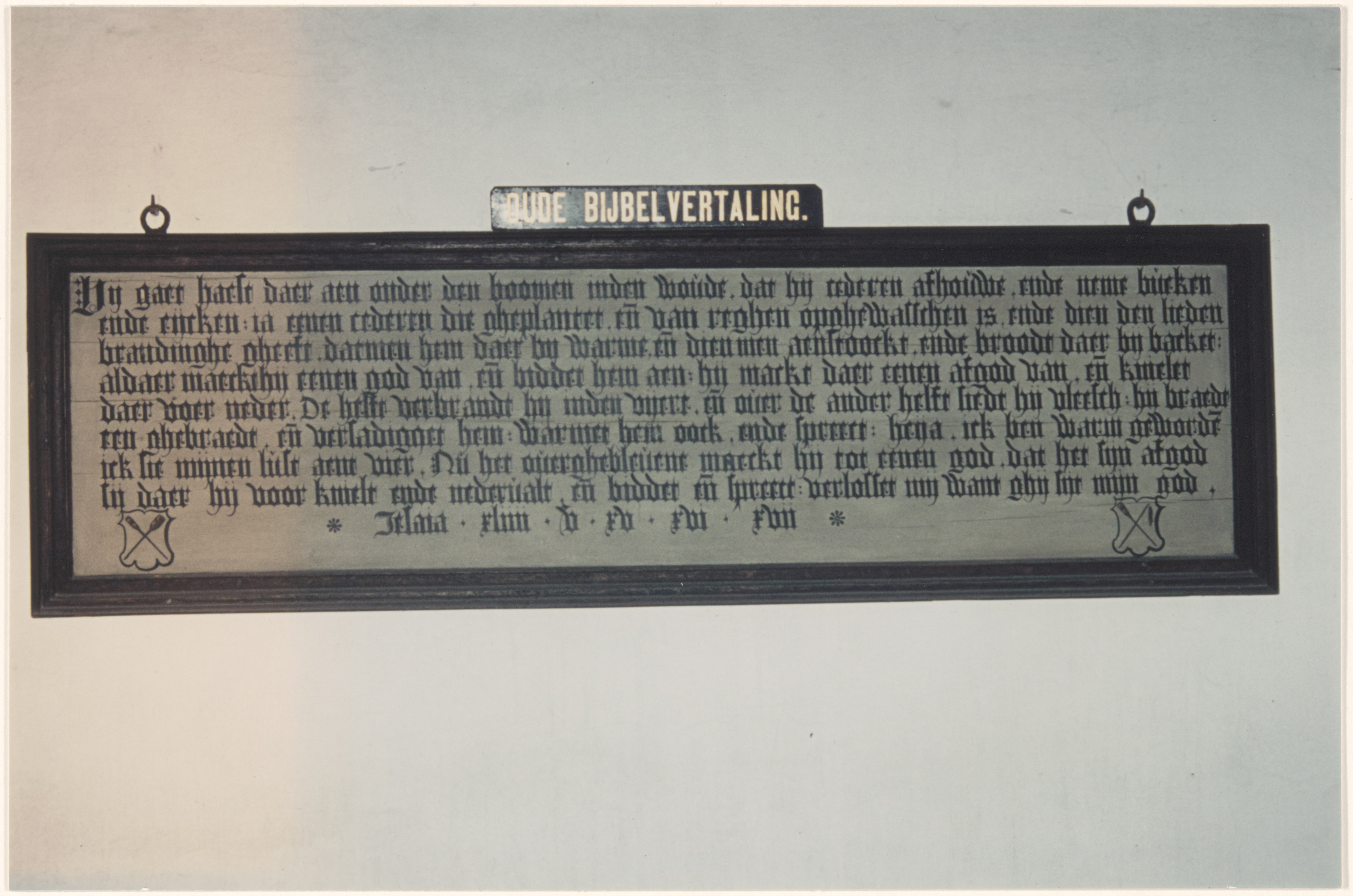 Tekstbord met een oude vertaling van Jesaja 44 vers 14 t/m 17; onderin de wapens van …