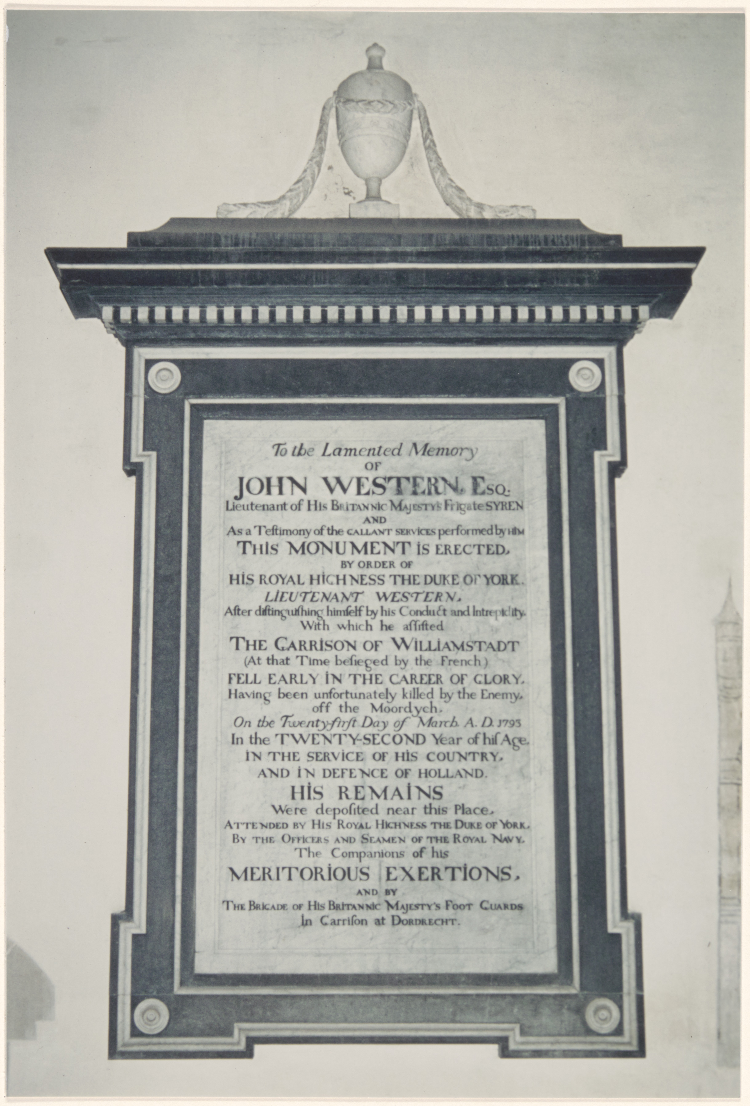- Grafzerk in de noordoostelijke kooromgang van de Grote Kerk, daar geplaatst in opdracht van de hertog van York ter herinnering aan John Western, een Engelse luitenant, die zich in het beleg om Willemsdorp in 1793 dapper gedragen had en op 21 maart van dat jaar sneuvelde.