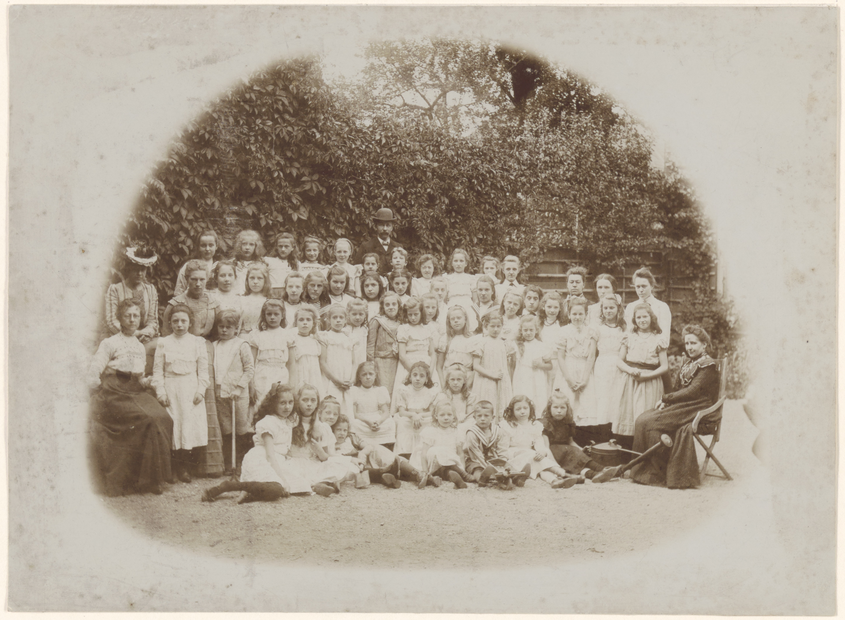 - Groepsportret van leerlingen en leerkrachten van school Mühring in de tuin van de school aan de Vrieseweg. Het meisje met het ovale brilletje, staande in de achterste rij, rechtsonder de onderwijzer met de bolhoed is Helena Johanna van Lutsenburg Maas geboren 4 maart 1892 te Veenwouden.