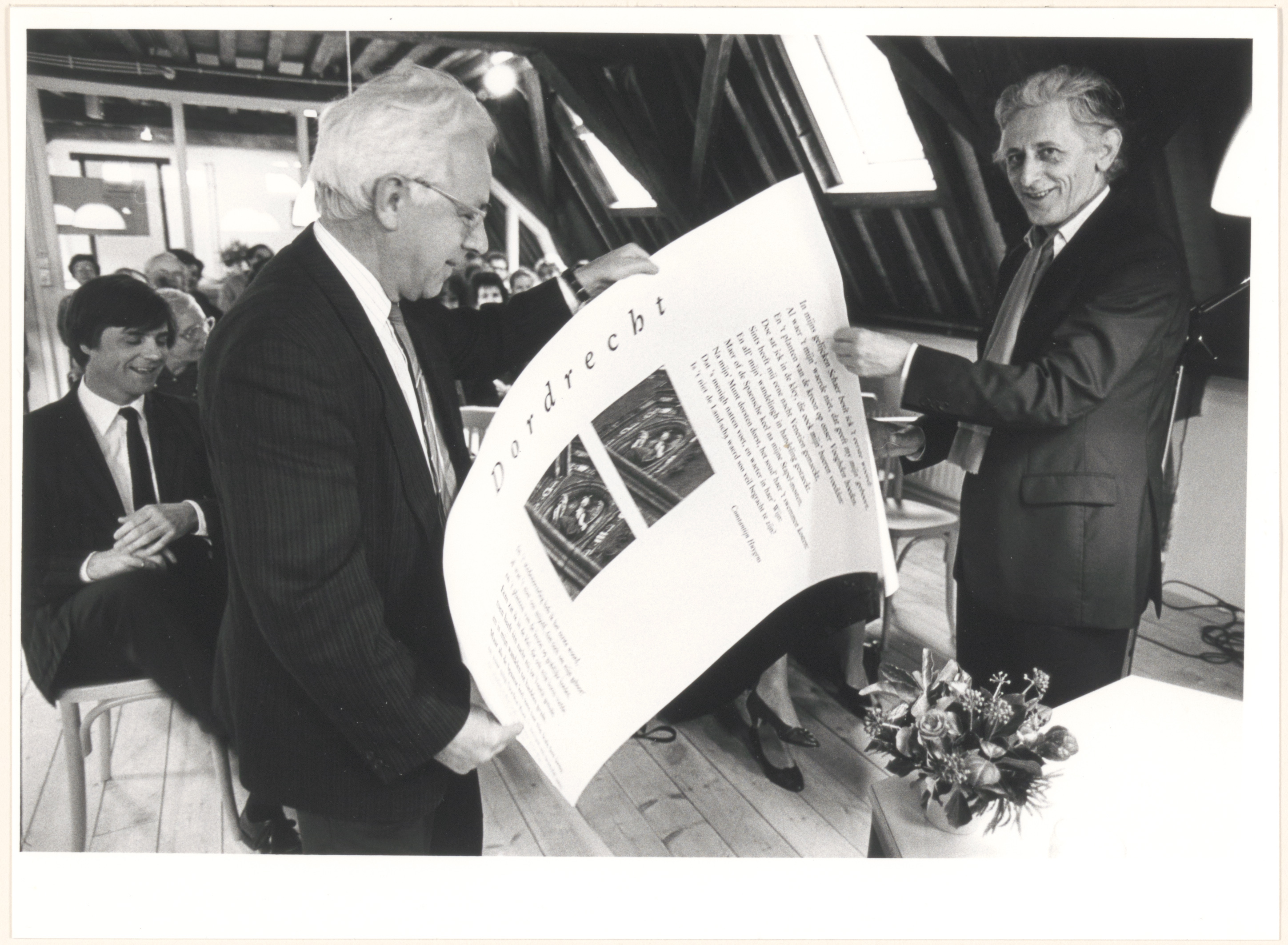 - Wethouder N.L.P. Lamers (rechts) biedt oud-Dordtenaar en Huygenskenner dr. L. Strengholt, hoogleraar Nederlandse letterkunde van voor 1770 aan de Vrije Universiteit te Amsterdam, het eerste exemplaar aan van een poëzie-affiche met de tekst van de 'stedestem' van Dordrecht door Constantijn Huygens en een vertaling door Jan Eijkelboom op de zolder van de bibliotheek aan de Groenmarkt. Links mr. M. Steenbeek, voorzitter van stichting Bibliotheek te Dordrecht.