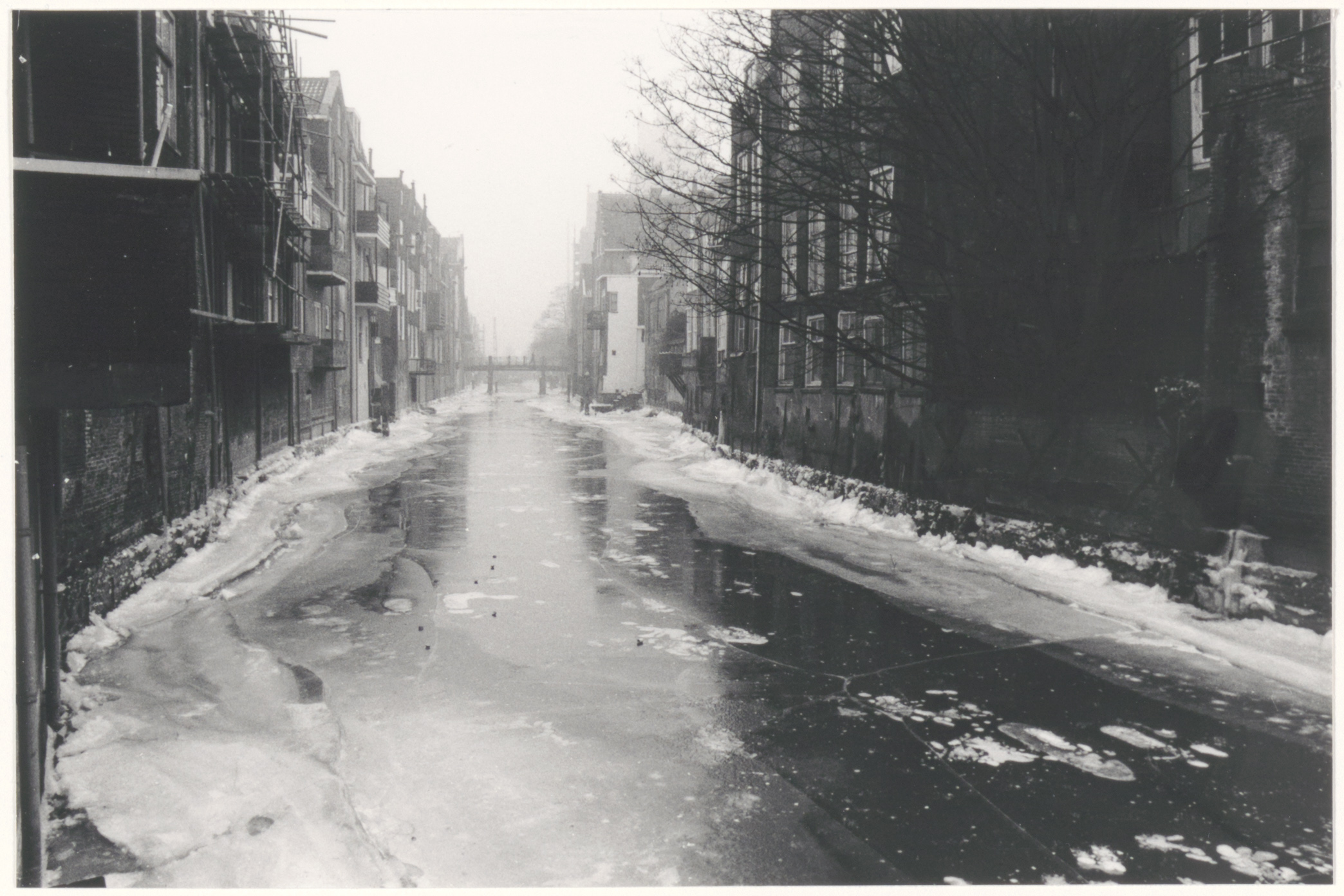 - De Voorstraatshaven, gezien vanaf de Grote Spuisteiger in de richting van de Pelserbrug; er ligt ijs. Links de Voorstraat, rechts de Grotekerksbuurt.