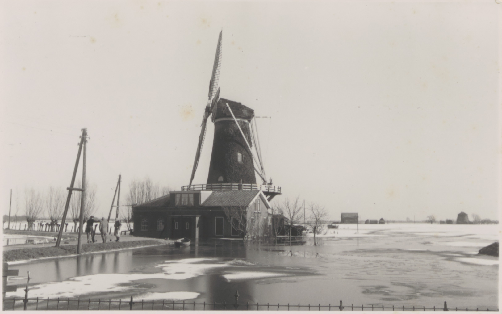 - Watersnood 1 februari 1953 te Oud-Alblas. De korenmolen van de gebroeders De Groot in het water. De weg is hier wel droog gebleven
