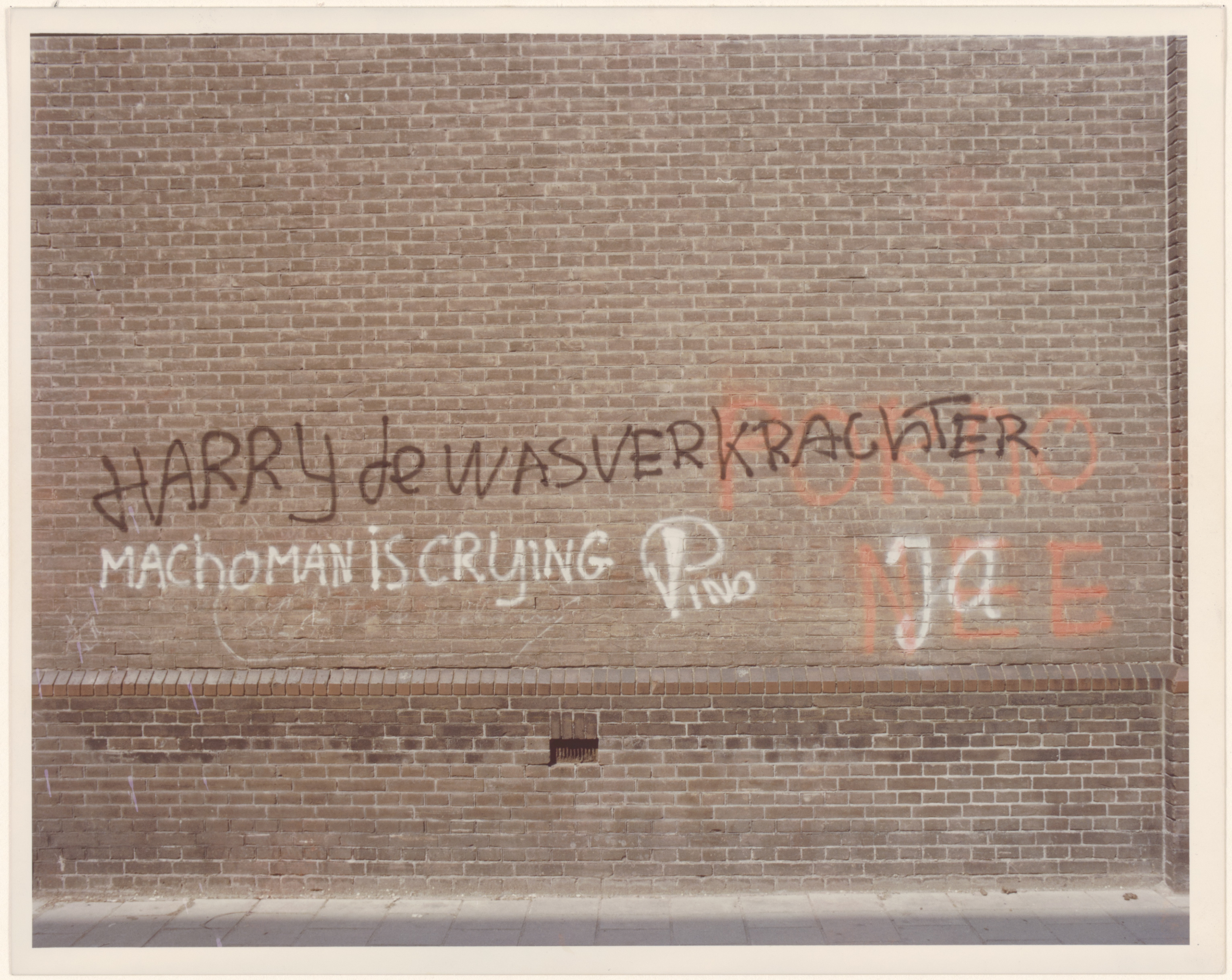 Blinde muur aan de noordzijde van de Gravenstraat (tegenover het Vrouwenhuis) waarop de volgende teksten in wit, zwart en wit krijt (of inkt): 'porno nee', waardoorheen 'ja' 'Harry de wasverkrachter' 'machoman is crying' 'Vino' (Pino?).