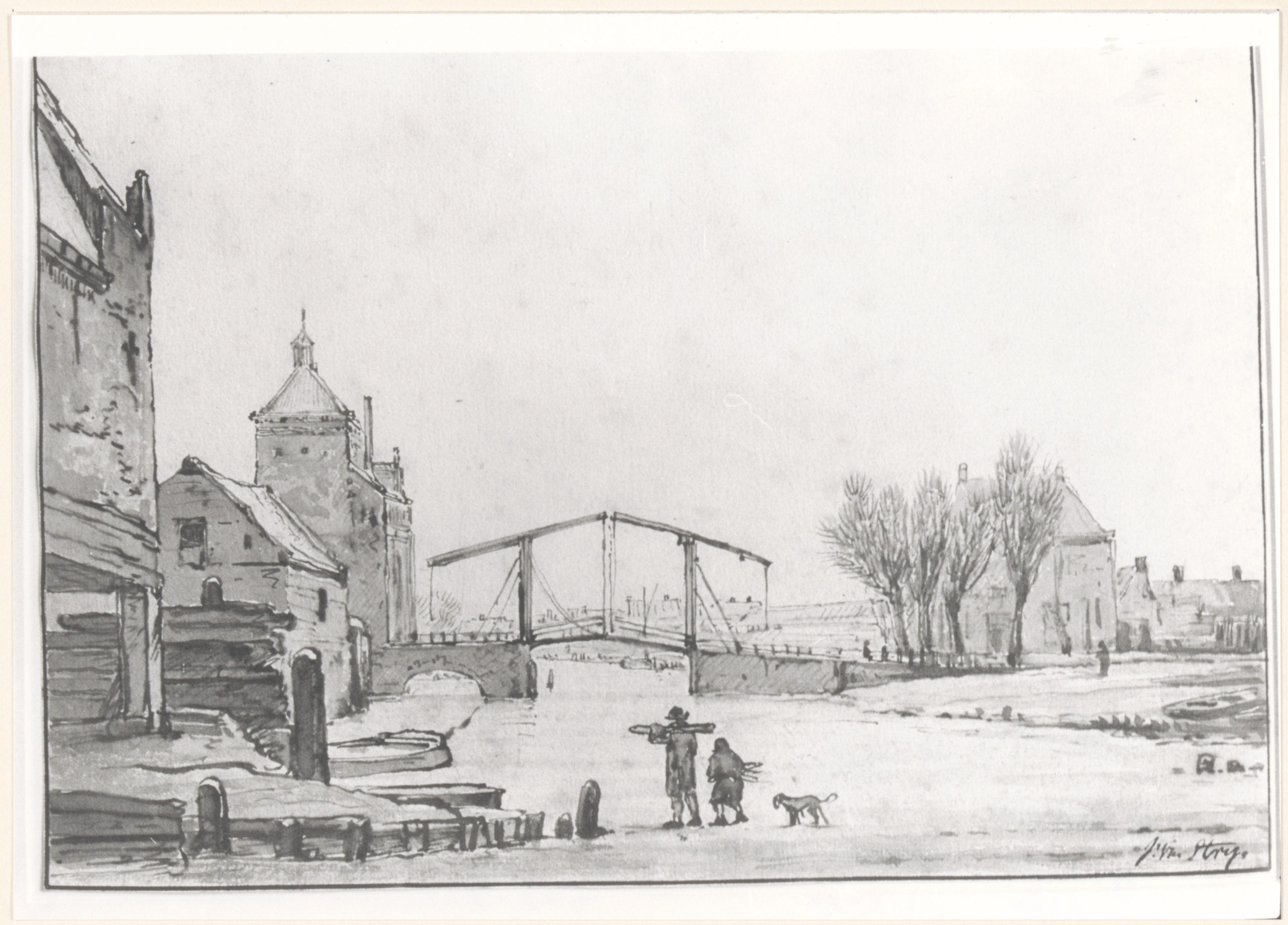 Tekening van de bevroren Spuihaven gezien vanuit het westen naar de Spuipoort en Spuibrug. Het huis rechts is het westelijk einde van de lange loods, het Kapiteinshuis of Huis van de Officier aan de Cornelis de Wittstraat (in 1969 gesloopt).