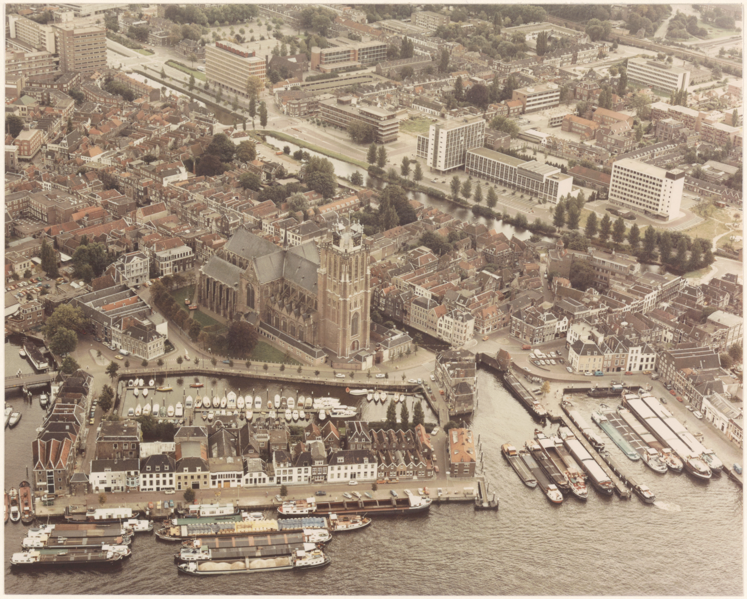 - Luchtfoto van het westelijk deel van de binnenstad, gezien naar het zuidoosten met centraal de Grote Kerk; onder de Oude Maas, rechts de Bomkade en links de Engelenburgerbrug; van midden rechts naar linksboven de Spuihaven en de Spuiboulevard; rechtsboven De Holland van 1859, de spoorweg en villa Weizigt.