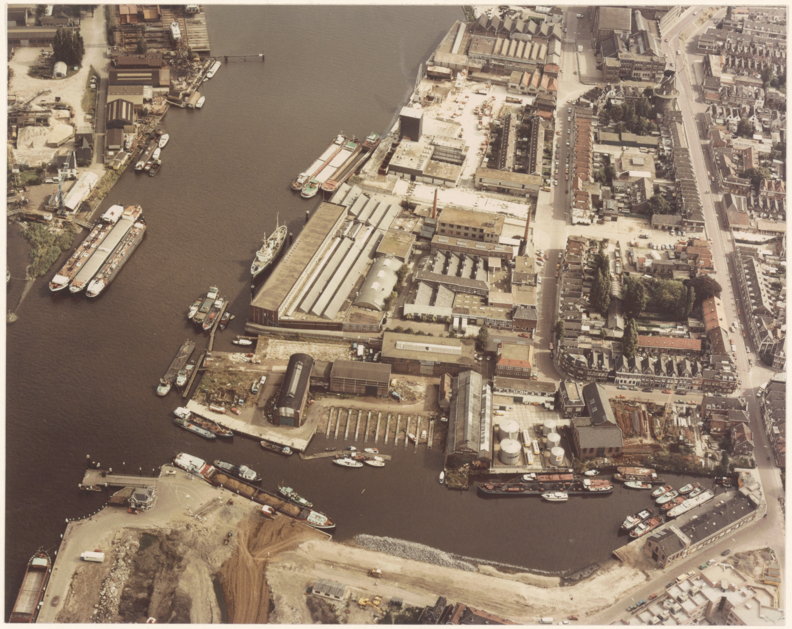 - Luchtfoto van de Riedijkshaven en het Lijnbaangebied, gezien naar het oosten. Rechtsonder nieuwbouw langs de Vest, linksonder het Papendrechts veerhuis en het terrein van de gesloopte gasfabriek aan de Merwekade, waarop zand wordt gestort dat uit een schip in de haven komt. Naar boven het woon- en industriegebied langs Lijnbaan en Noordendijk met in het midden de Viermolenshof; links het Wantij en een stukje Staart.