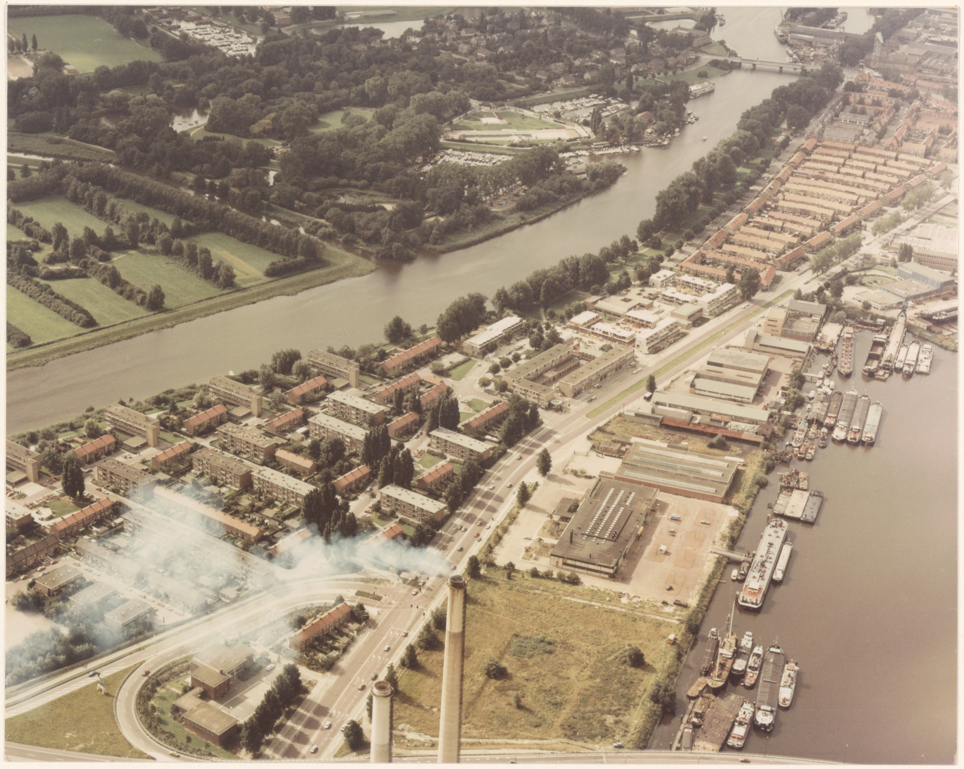 - Luchtfoto van een deel van de Staart, gezien naar het westen. Rechtsonder de Eerste Merwedehaven, onder twee pijpen van de Merwedecentrale, linksonder de op- en afrit van de Rondweg, daarboven het Wantij met de Prins Hendrikbrug, van middenonder naar middenrechts de Merwedestraat, linksboven het Wantijpark en links Jeugddorp.