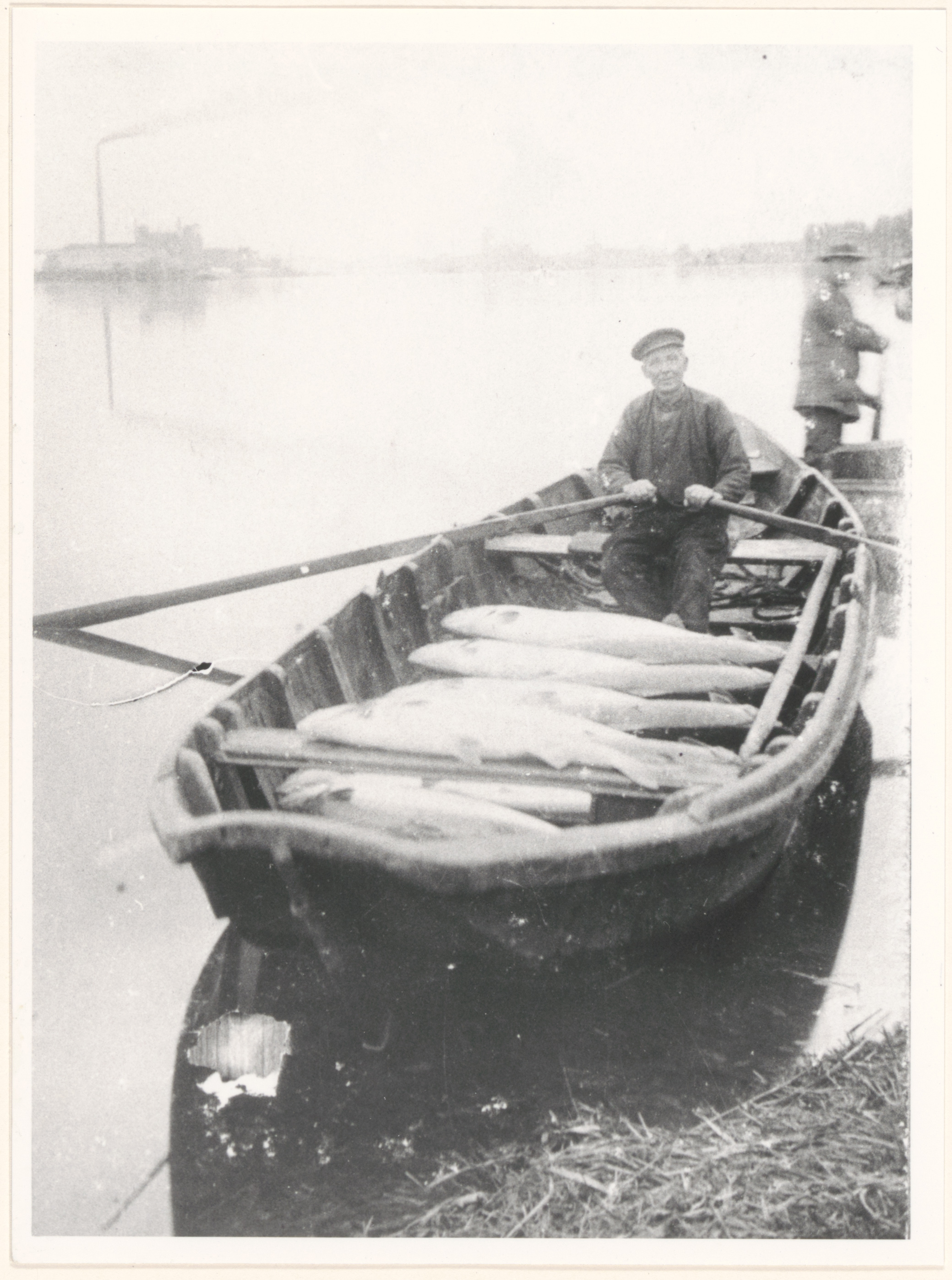 Roeiboot van zalmvisserij Volharding met een aantal zalmen aan boord in de Oude Maas …