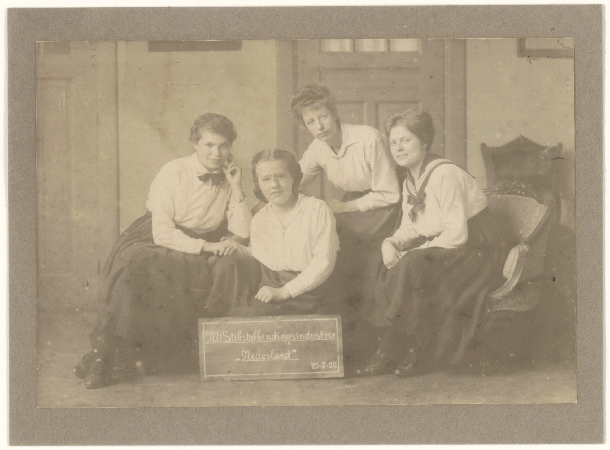 - Portret van vier dames, zittend in een huiskamer, voor zich een bordje, waarop geschreven 'NV Stikstofbindingsindustrie "Nederland" 29-2-20'. De dame rechts is mevr. Deibel - 't Hart, mogelijk gehuwd met Martinus Deibel, geboren te Arnhem op 27 juli 1891, werktuigbouwkundige; de datum kan samenhangen met de bouw van de fabriek aan de Zeehaven in 1920.