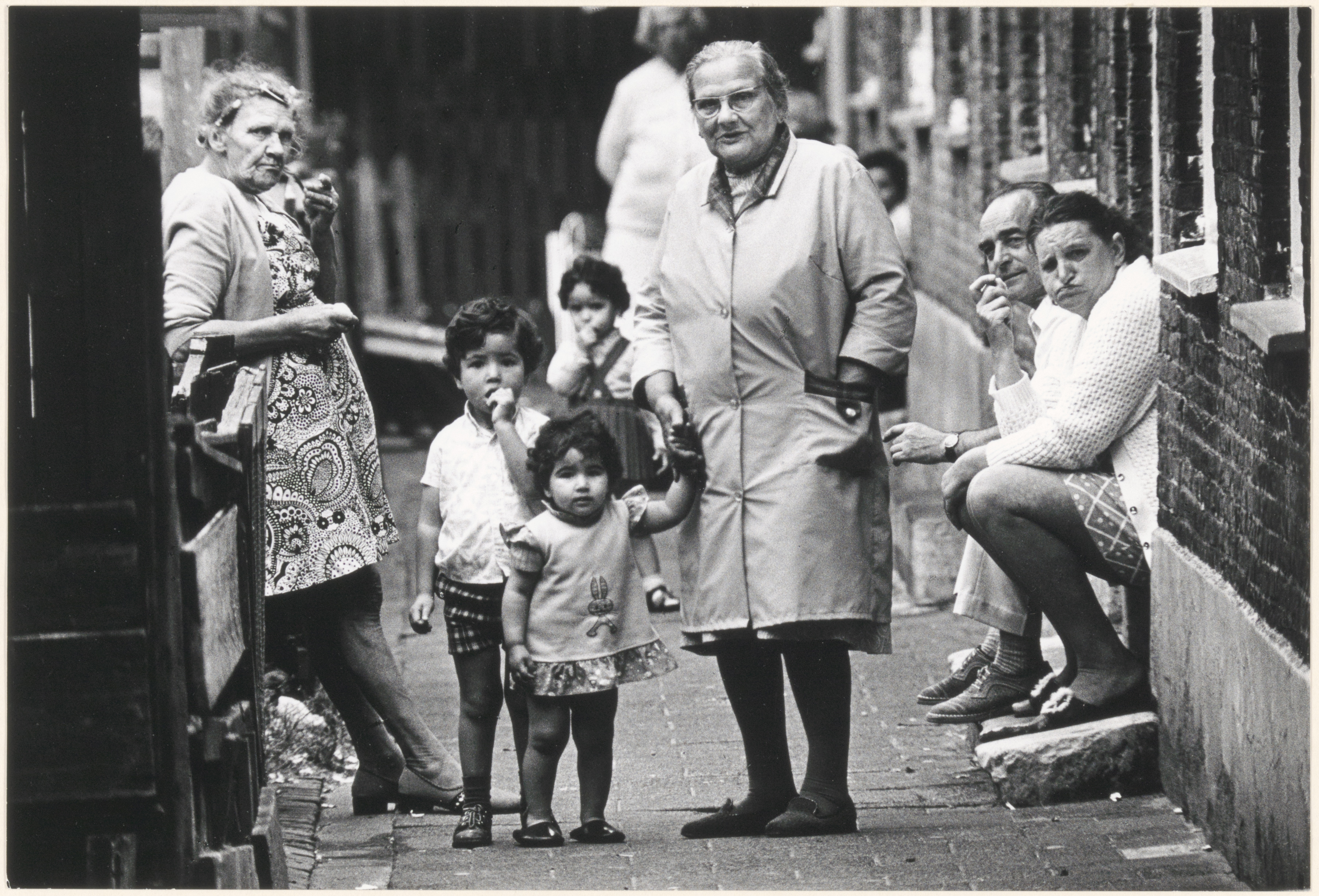 - Straattafereeltje met buurtbewoners van het Lijnbaangebied: mensen zitten in hun deuropening, een vrouw leunt tegen een hekje, een oudere dame begeleidt twee kinderen.