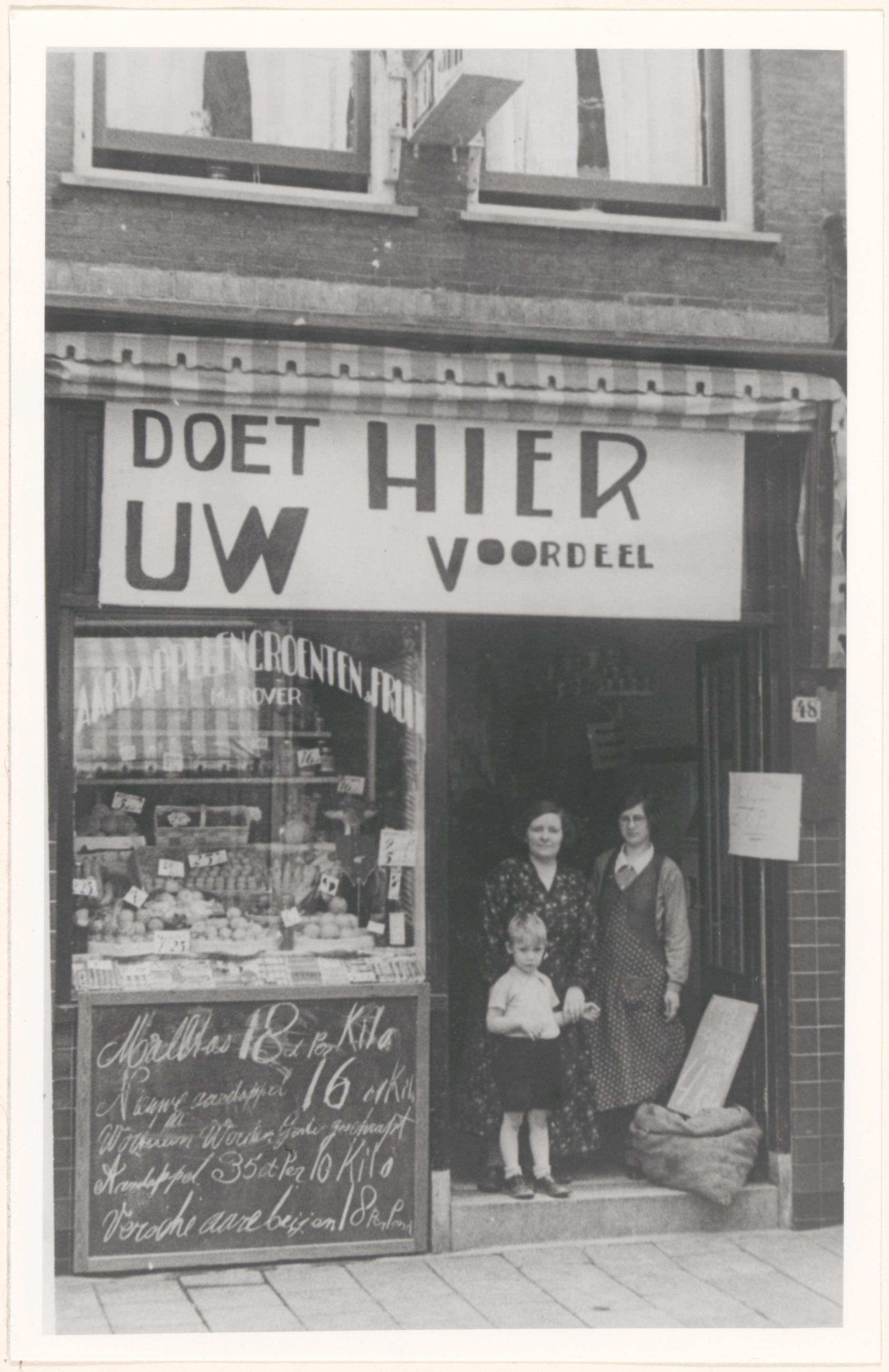 Pui van het pand Voorstraat 48 (nr. in 1938), waarin gevestigd de winkel in aardappelen, groenten en fruit van M. de Rover. In de deuropening staan links mevr. Kaatje de Rover-Brunsveld, rechts Johanna de Rover en ervoor Cornelis de Rover (die tot 1990 de winkel beheerde).