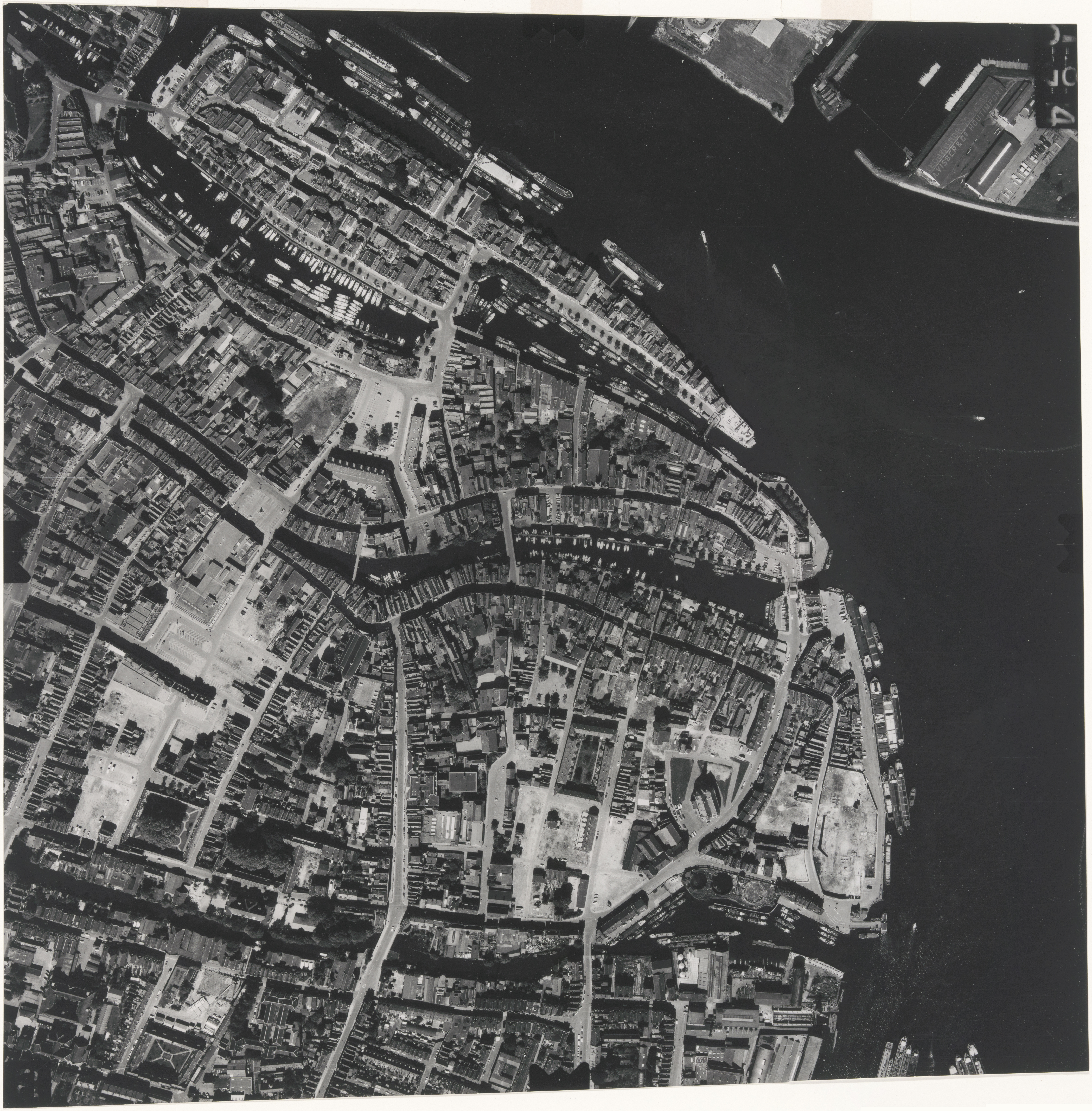 Luchtfoto van de Noordelijke binnenstad, rechtsboven de Grote Kerk, linksonder …
