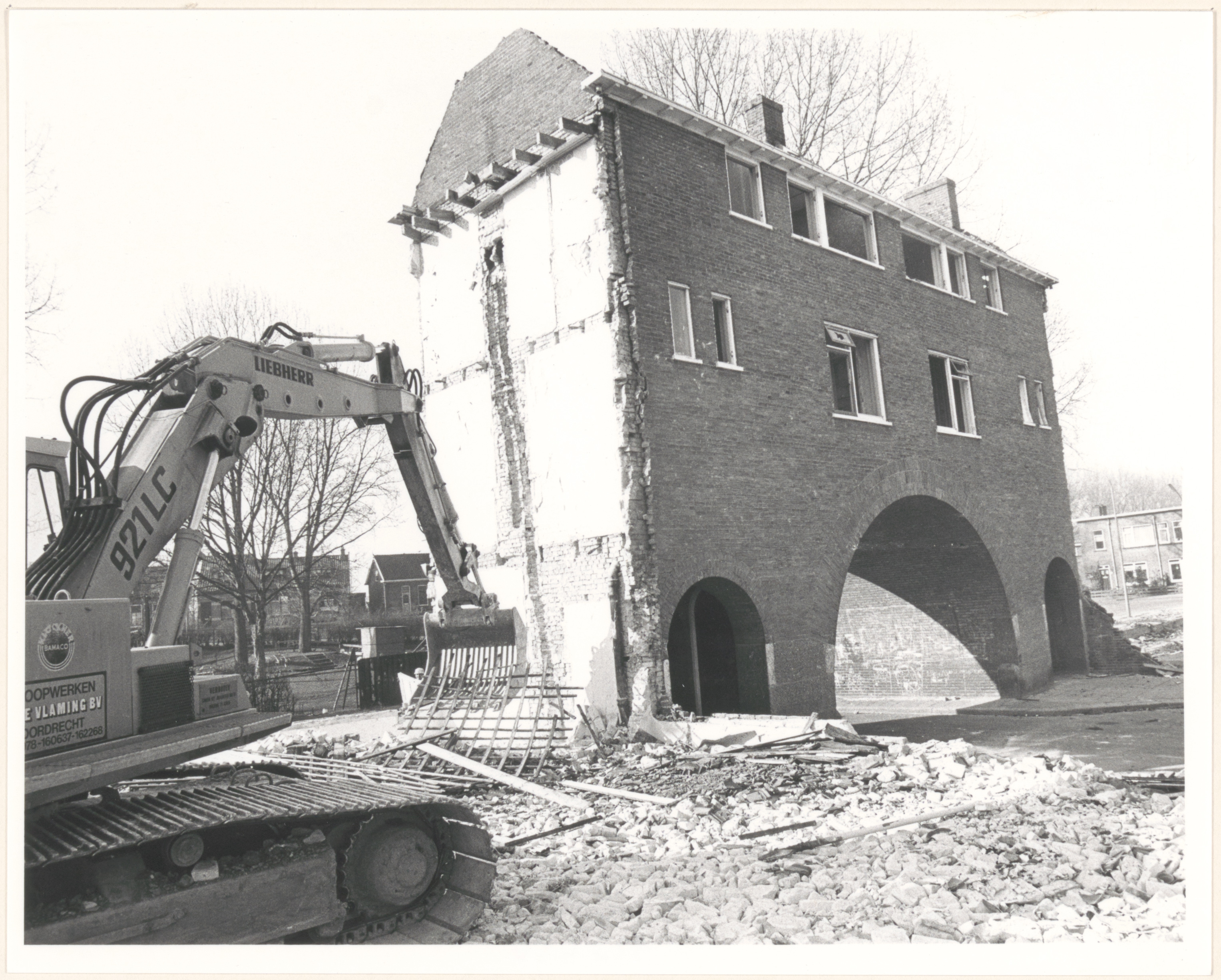 De sloop van huizen (met doorrijpoort) aan het Marisplein; op de voorgrond een hydraulische universele machine met vork van de Dordtse firma in sloopwerken A. de Vlaming BV.