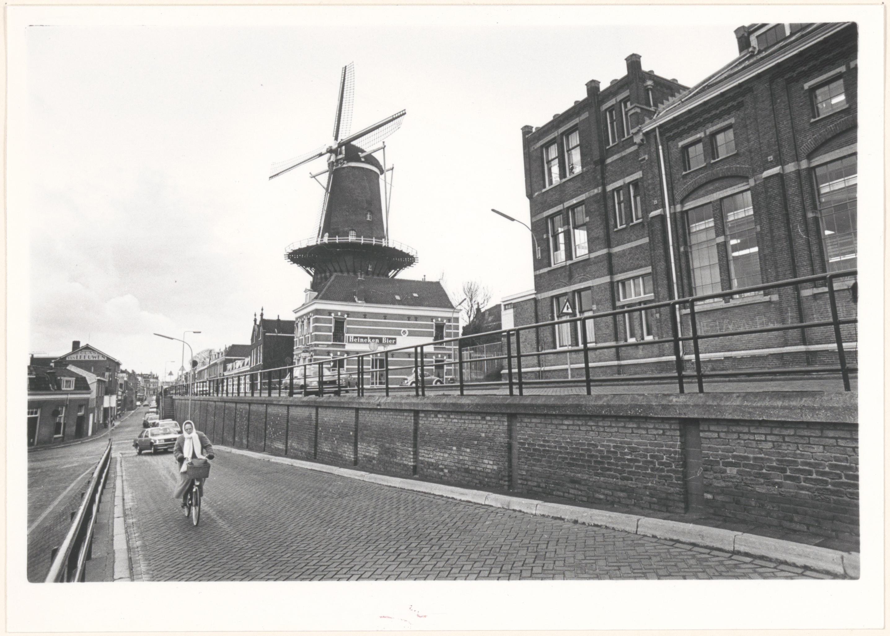 - De Noordendijk naar westen gezien vanaf de elektriciteitscentrale. Molen Kijck over den Dijck staat op de hoek van de Biesboschstraat. De zijstraat links is de Godfried Schalckensingel.