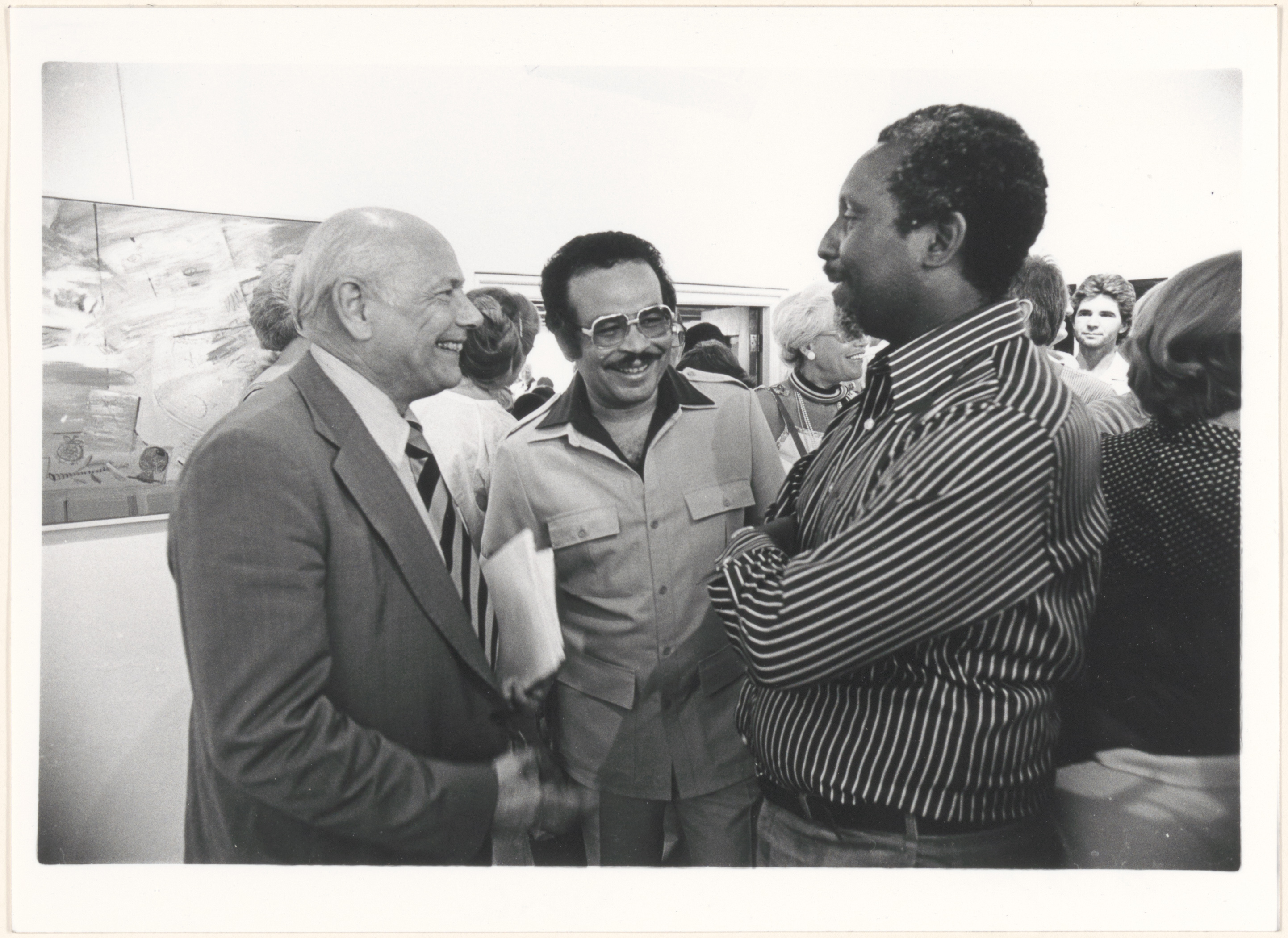 - Joop den Uyl in gesprek met de Antilliaanse kunstenaar José Maria Capricorne, wiens tentoonstelling in Galerie 56-58 in de Nieuwstraat hij zojuist heeft geopend.