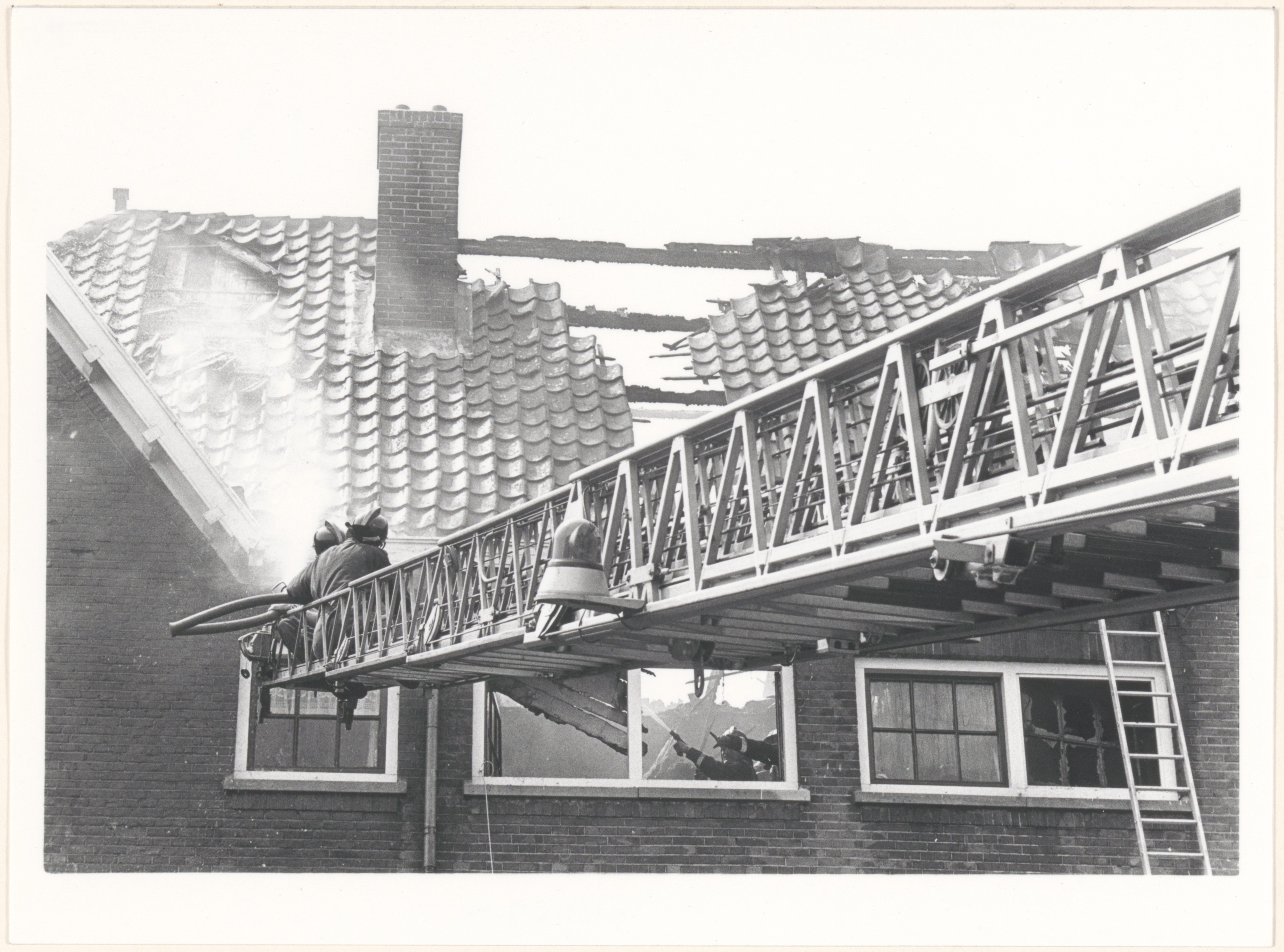 Brandweerlieden op een ladderwagen en ook in het huis bestrijden een door reparatiewerkzaamheden veroorzaakte brand in een huis aan de Krispijnseweg.