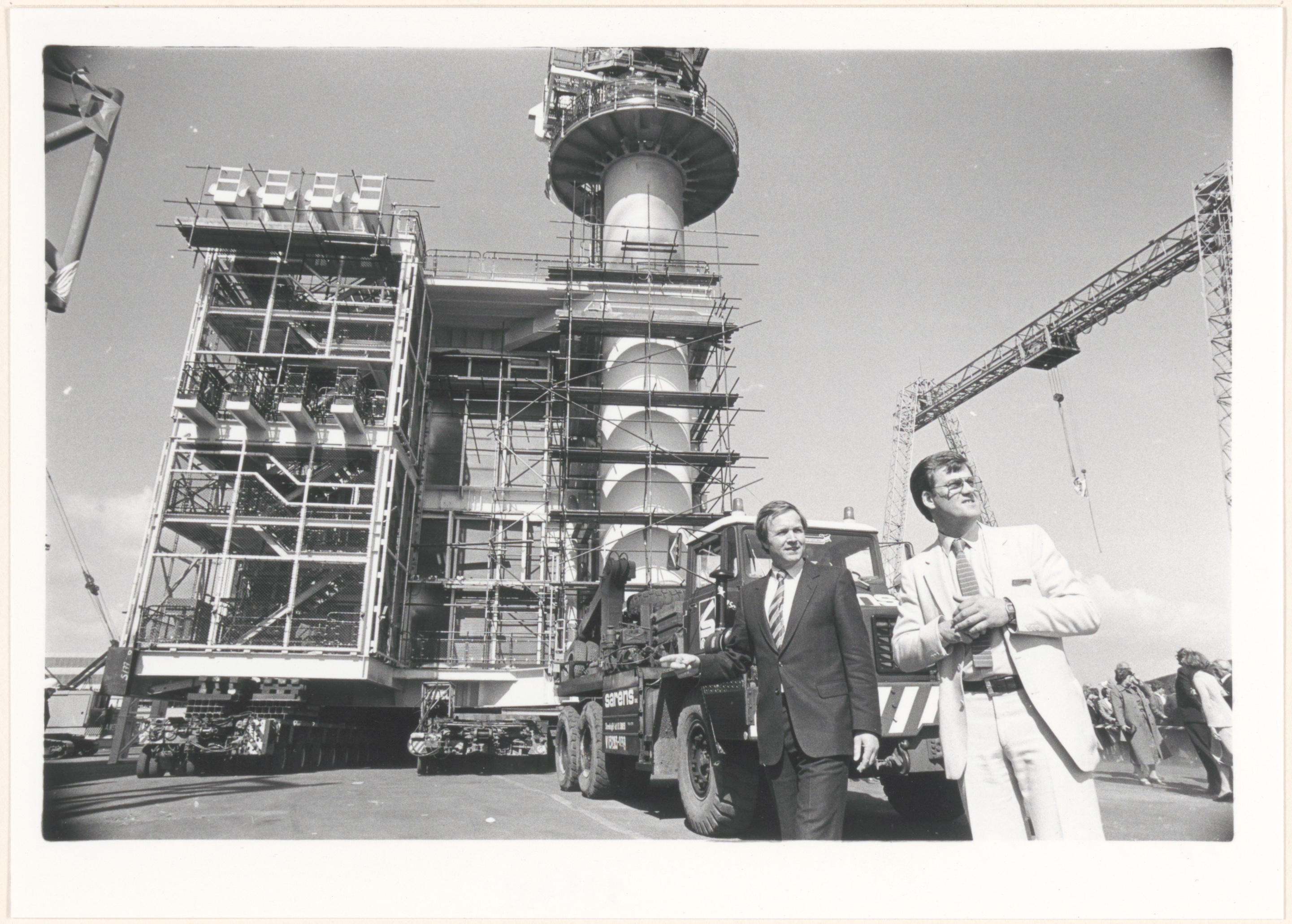 Vertrek van een onderdeel van een olieplatform van 1500 ton van de werf van Penn en Bauduin. Het is een van de zes modules die in de Noordzee zullen worden samengevoegd. Kennelijk was het transport zo spectaculair dat dr. J.C. Terlouw, vice-minister-president en minister van economische zaken (links), kwam kijken.