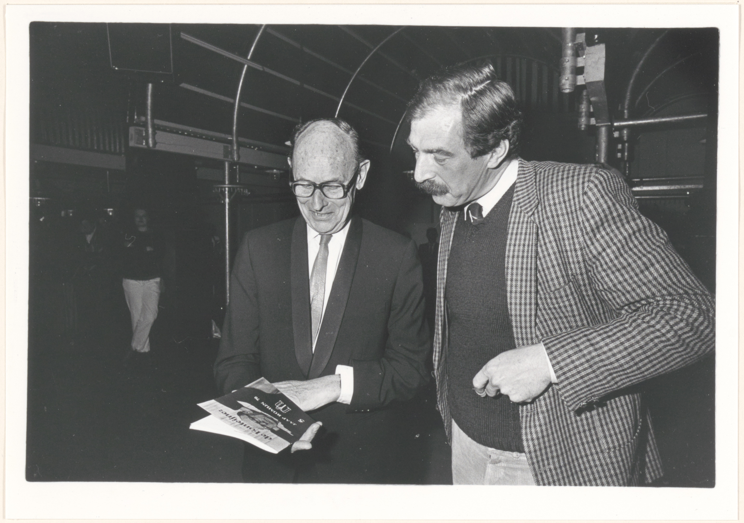 Literator en uitgever Jaap Romein (links) bladert in een aflevering van het Dordtse literaire kwartaalblad De Fonteijne, die aan hem gewijd is. Wethouder G. Meelker kijkt met hem mee.