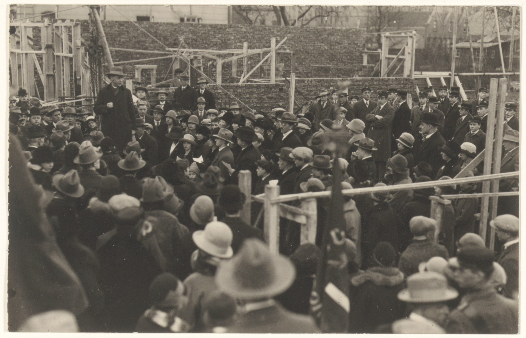 De eerstesteenlegging van het CJMV-gebouw aan de Burgemeester de Raadtsingel door A.J. …