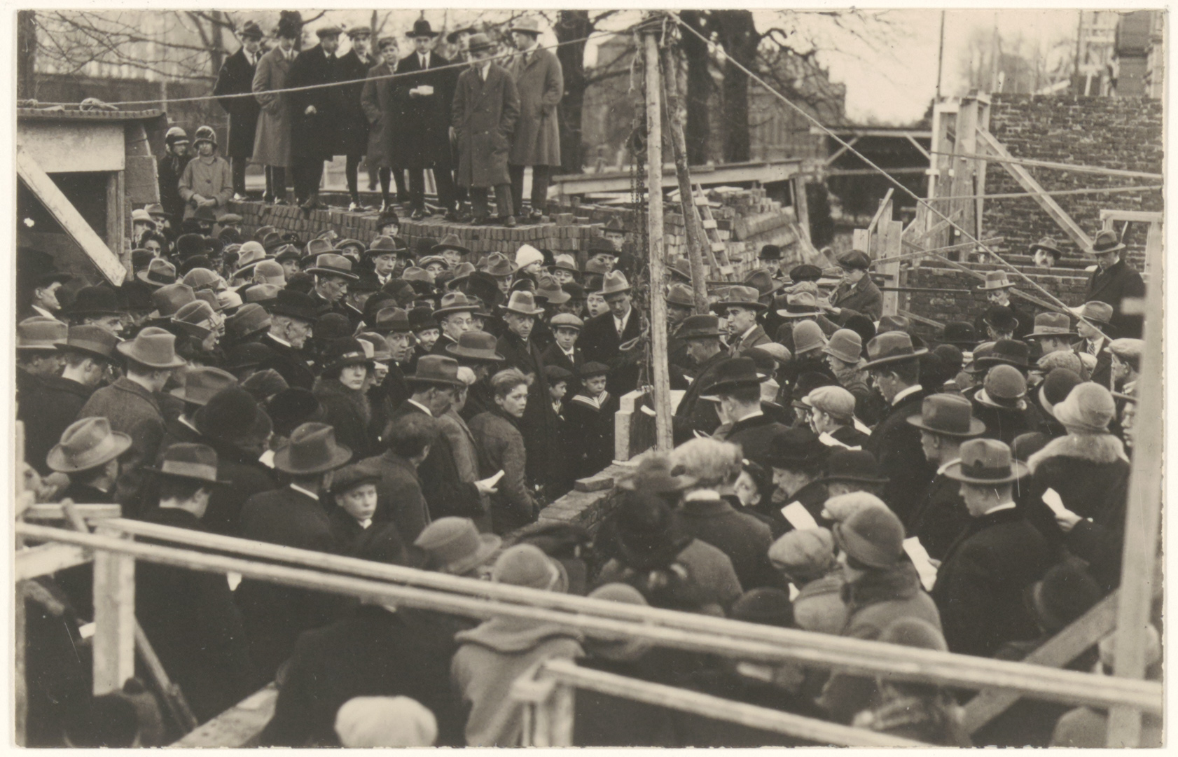 De eerstesteenlegging van het CJMV-gebouw aan de Burgemeester de Raadtsingel door A.J. …