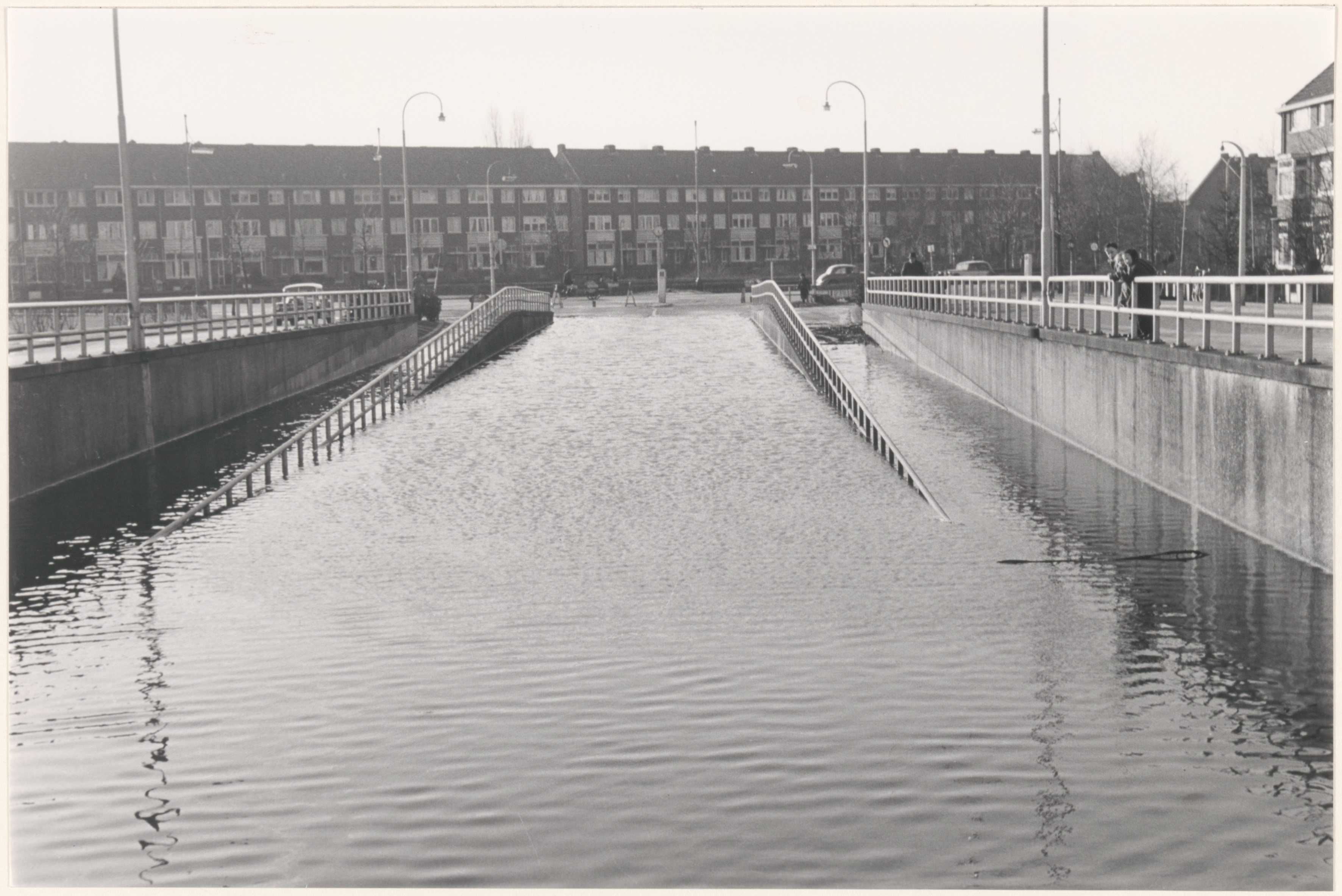 De bij de overstroming van 1 februari 1953 volgelopen Krispijntunnel naar de Van Baerlestraat gezien.