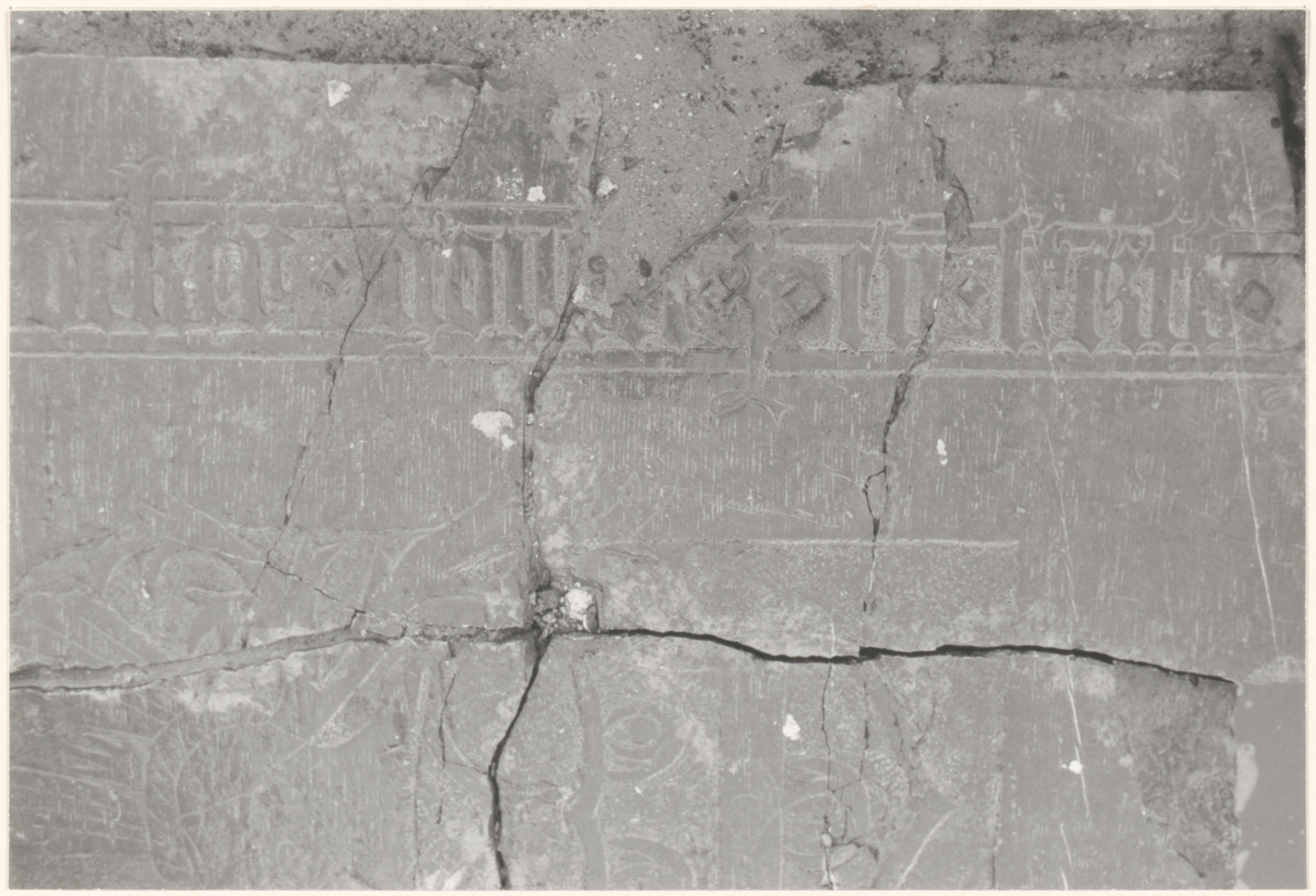 De opgraving van een grafsteen bij de Nieuwkerk, uitgevoerd door Openbare Werken in aanwezigheid van medewerkers van het Gemeentearchief. Het randschrift luidt: 'hier leit begraven ocker govers ende sterff s/ (15) 04 27 in december bid voer siel' met in het midden het wapen van de familie die zich later Van Moësienbroek ging noemen.