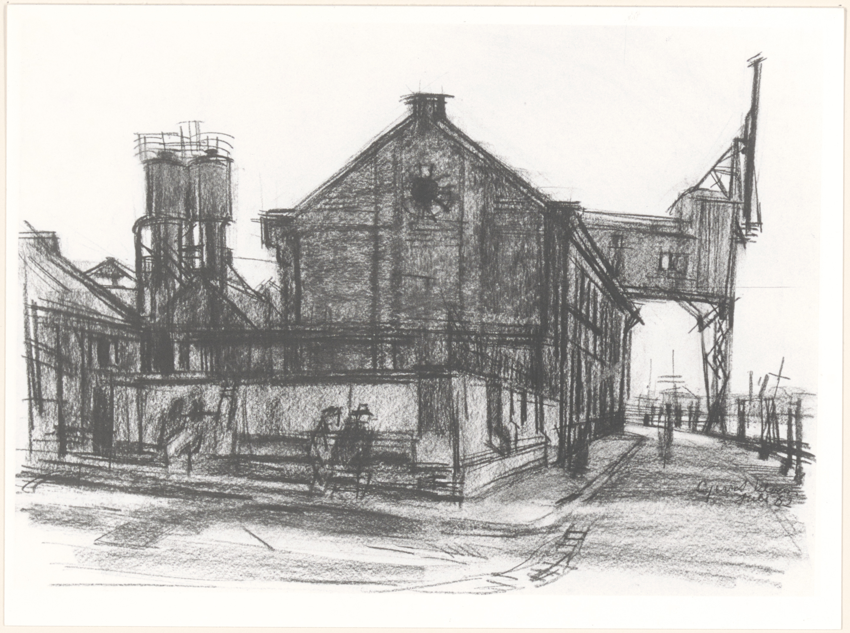 Tekening van de gasfabriek aan de Merwekade, gezien naar het westen vanaf de Bleijenhoek.