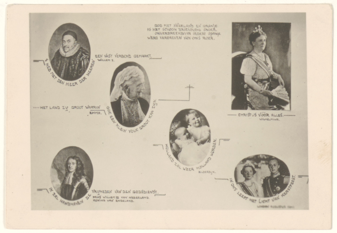 - Foto's van de koninklijke familie werden tijdens de tweede wereldoorlog boven Dordrecht gedropt door geallieerde vliegtuigen ter bemoediging van de bevolking. Op deze collage portretjes van de prinsen Willem I, Willem III en Bernhard, de koninginnen Emma, Wilhelmina en Juliana en de prinsessen Beatrix en Irene.
