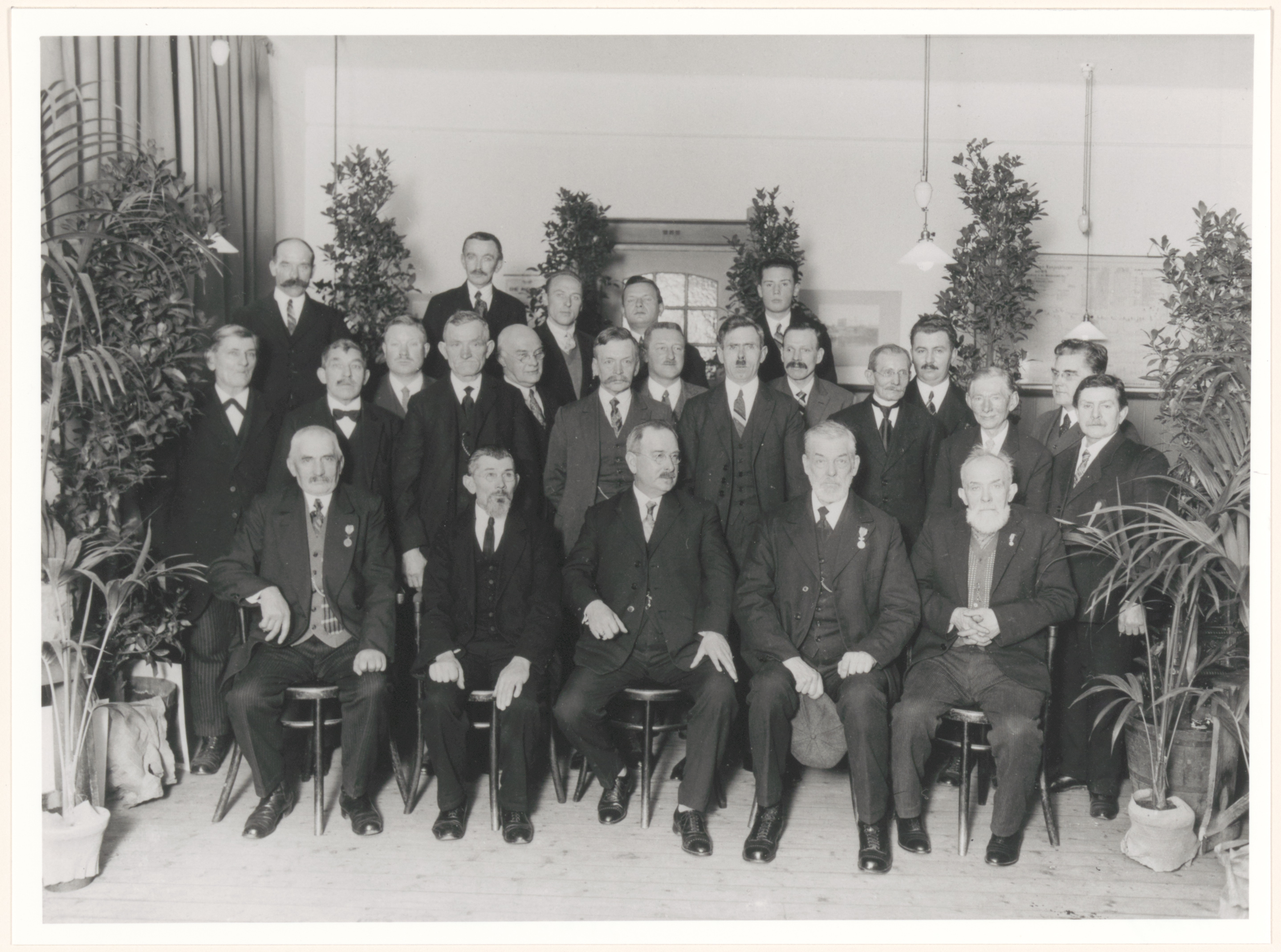De directiemedewerkers van het metaalconstructiebedrijf Penn & Bauduin. Drie heren dragen een lintje. Middenvoor directeur Hendrik Gijsbert Willem van Aardenne.