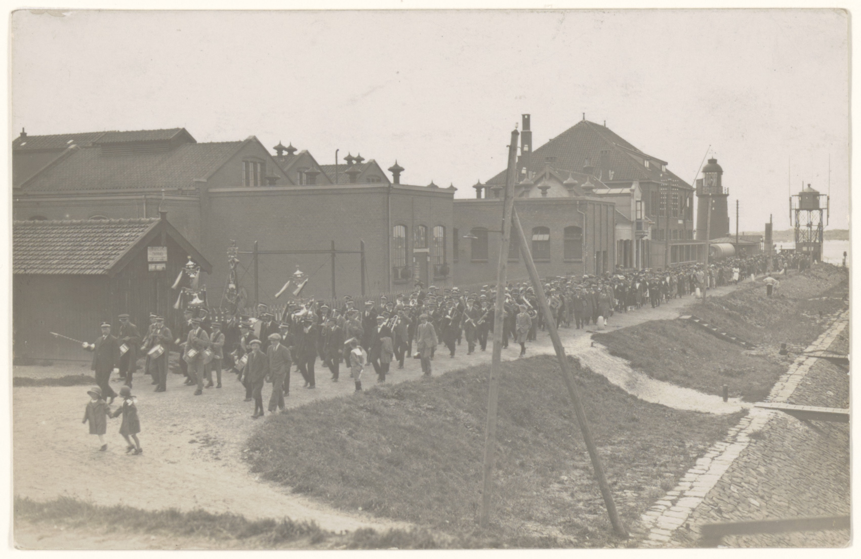 Een groep Dordtenaren voorafgegaan door muziekkorps Voorwaarts loopt door Hoek van Holland; op de achtergrond de Nieuwe Waterweg, een vuurtoren en een semafoor(?).