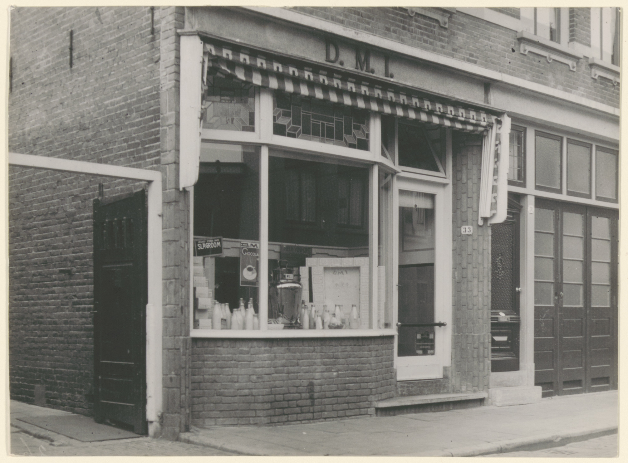 Etalage van een verkooppunt van de DMI aan het Kromhout nr. 33 (oud nr.); links de toegang tot de DMI-melkfabriek.