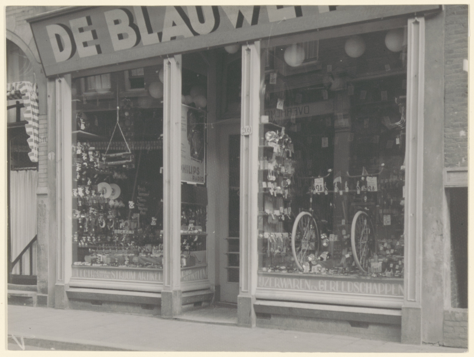 Etalages van De Blauwe Pui, een winkel in radio, elektriciteit, ijzerwaren, …