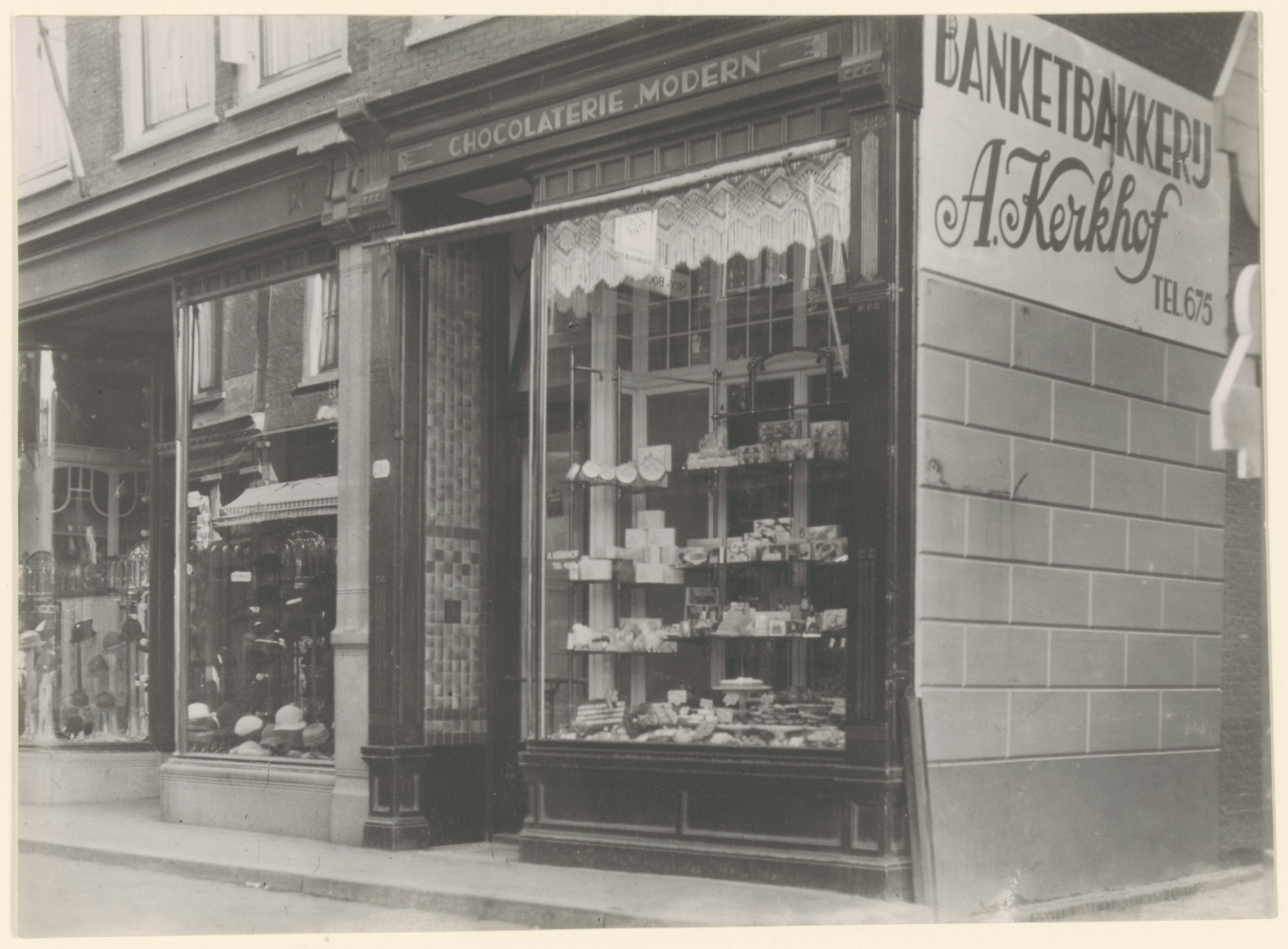 - Etalage van banketbakkerij/lunchroom A. Kerkhof aan de Voorstraat 210 (oud nr.) op de hoek van de Kolfstraat (rechts); links Dameshoedenmagazijn De Vlinder op nr. 208 (eveneens oud nr.).
