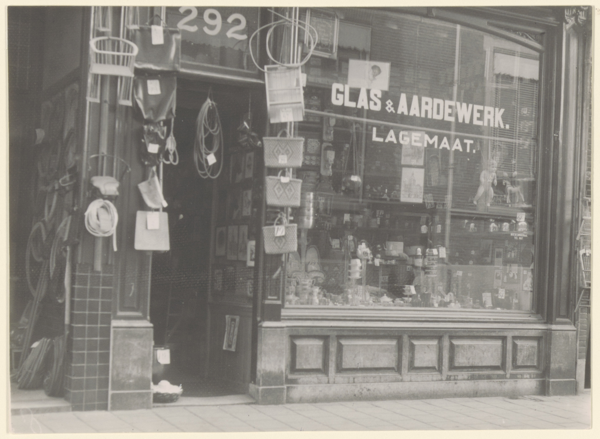 - Etalage van de winkel in glas en aardewerk van A. v.d. Lagemaat aan de Voorstraat 292 (oud nr.); filiaalhouder was K. Bosua.